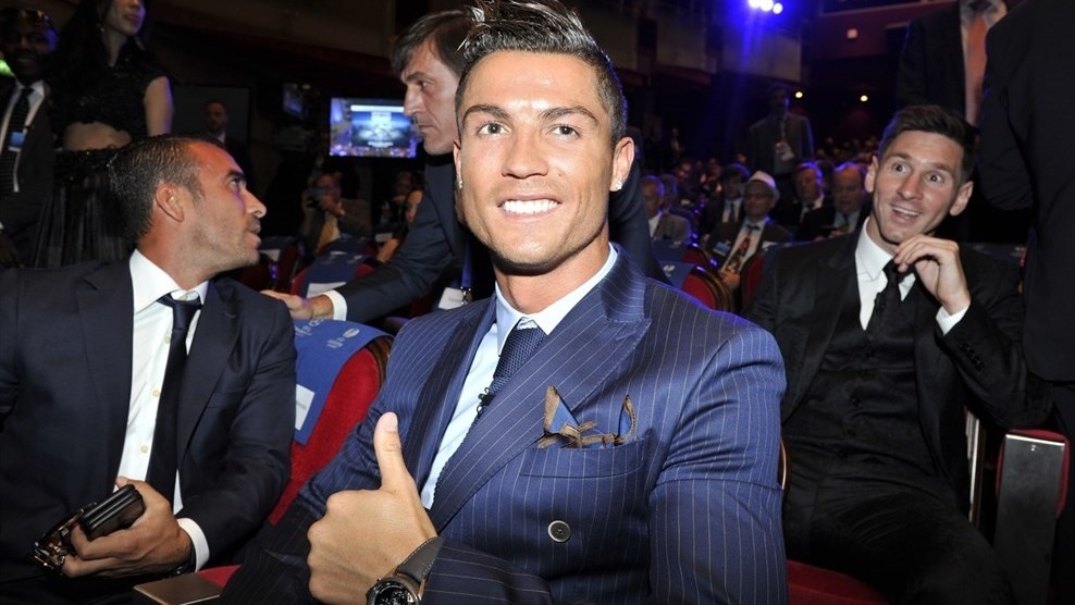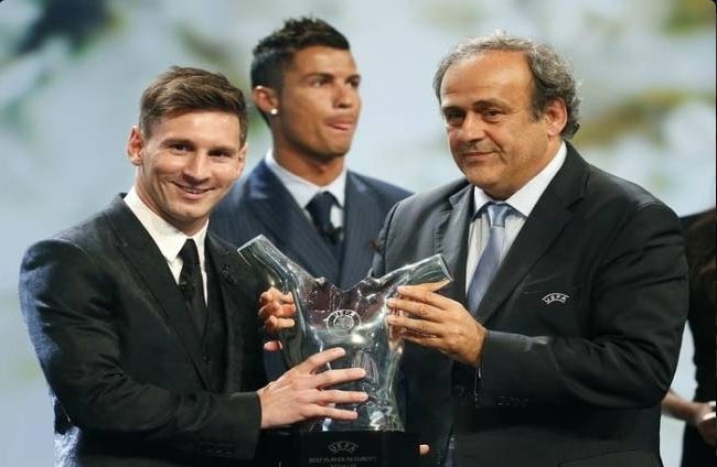 Lionel Messi nhận danh hiệu cầu thủ xuất sắc nhất châu Âu mùa giải 2014 - 2015 từ Chủ tịch Liên đoàn bóng đá châu Âu (UEFA), Michel Platini. Phía sau, Ronaldo lè lưỡi và không quan tâm đến khoảnh khắc đối thủ được vinh danh. Mùa giải 2013 - 2014, CR7 là chủ nhân của giải thưởng cá nhân này.