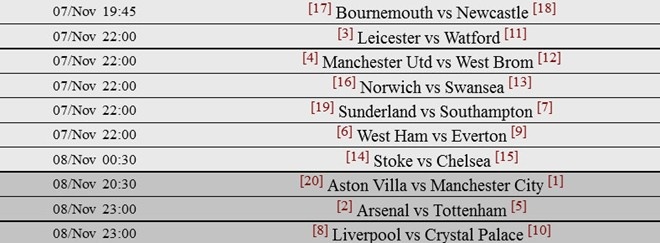 | Lịch thi đấu của vòng 12 Ngoại hạng Anh diễn ra cuối tuần này. Chelsea sẽ làm khách trên sân Stoke City lúc 0h30 ngày 8/11. |