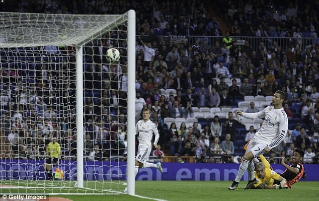 | Trước đó vào phút 49, Ronaldo sút tung lưới Almeria sau đường chuyền của Kroos. Tuy nhiên, trọng tài không công nhận bàn thắng vì cho rằng cựu sao M.U rơi vào thế việt vị. |