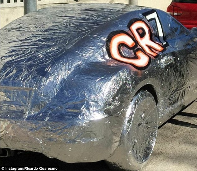 | Chỉ cần một lớp giấy bạc, một chút sơn màu, anh đã độ thành công chiếc xe của đồng đội Quaresma theo phong cách CR7. Quaresma tỏ ra bất ngờ sau khi chiếc xe của mình được CR7 thay áo mới. |