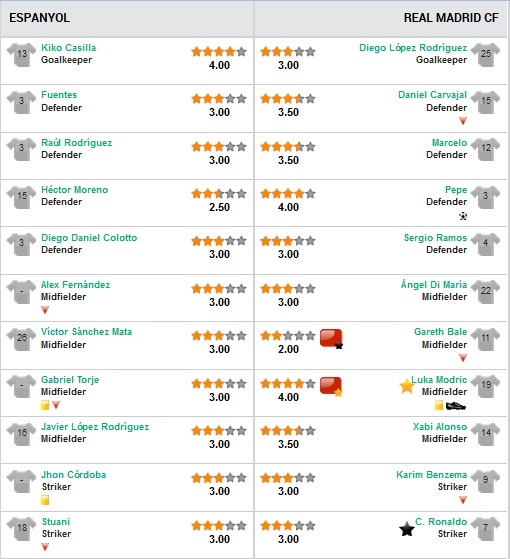 Song cầu thủ chơi tệ nhất bên phía Real không phải là Ronaldo, mà là Bale. Bản hợp đồng kỷ lục 100 triệu euro gần như mất hút trước hàng phòng ngự của Espanyol. Trong suốt 76 phút trước khi bị tay ra, tuyển thủ xứ Wales chỉ tung ra duy nhất 1 pha dứt điểm không thực nguy hiểm. Những đường chuyền của Bale cho đồng đội cũng không gây ra sự đột biến. Đây chính là lý do Bale phải nhận điểm 2 ở trận này.