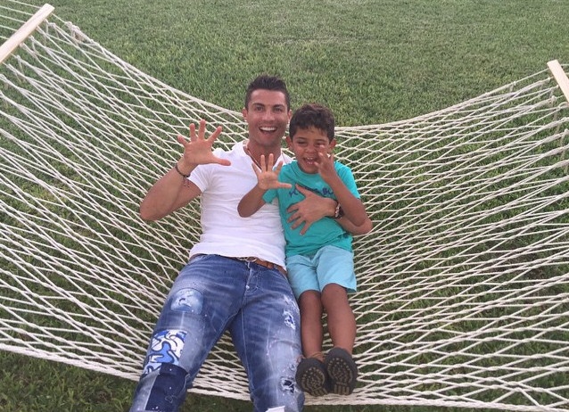 | Sau khi xuất sắc lập hat-trick giúp tuyển Bồ Đào Nha giành chiến thắng quan trọng 3-2 trước Armenia tại vòng loại EURO 2016, Cristiano Ronaldo lập tức trở về quê nhà. Ngày 17/6, CR7 vui vẻ đón sinh nhật lần thứ 5 của cậu con trai Cristiano Ronaldo Jnr. |