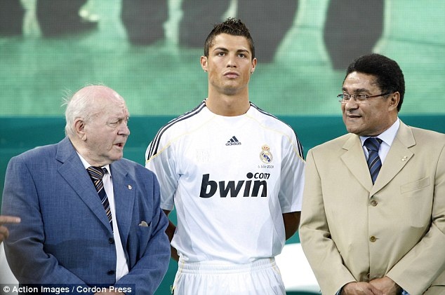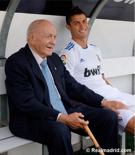 | Hai cố huyền thoại Di Stefano và Eusebio chụp ảnh trong ngày ra mắt Cristiano Ronaldo năm 2009. |