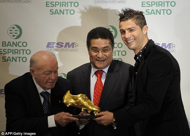 | Cristiano Ronaldo chụp ảnh lưu niệm cùng với hai bậc tiền bối Di Stefano và Eusebio sau khi giành Chiếc giày vàng năm 2011. |