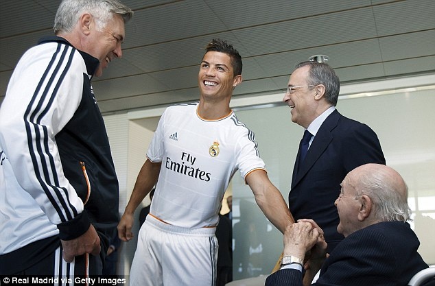 | Cristiano Ronaldo, HLV Carlo Ancelotti và Chủ tịch Florentino Perez trong một lần thăm huyền thoại Di Stefano. |