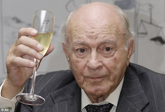 | Huyền thoại Di Stefano nâng ly chúc mừng Đại sứ Argentina ở Madrid. |