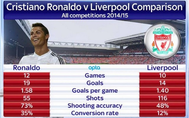 | Thành tích của Ronaldo tại giải năm nay hơn hẳn cả đội Liverpool gộp lại. |