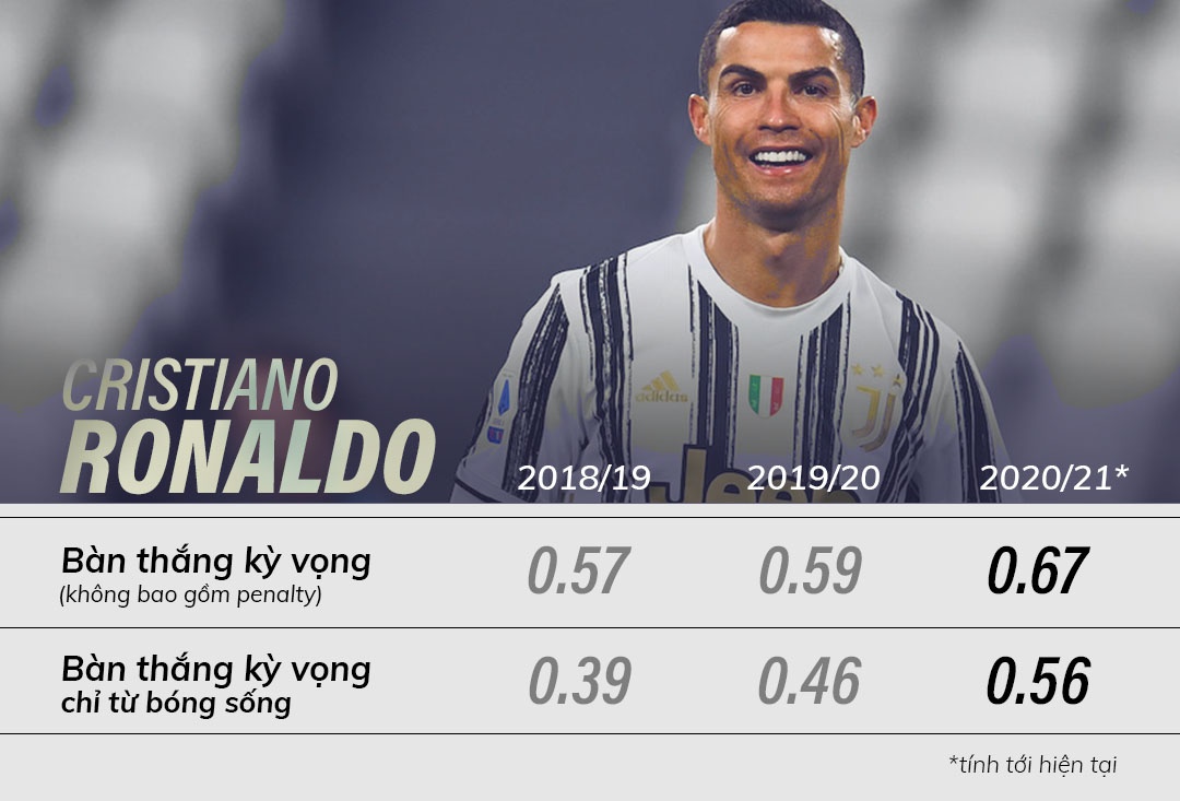 Chỉ số bàn thắng kỳ vọng của Ronaldo (không bao gồm penalty) tăng lên 0,67. Đây là thống kê tốt nhất của siêu sao người Bồ Đào Nha từ khi chơi cho Juventus. Ở các mùa 2018/19 và 2019/20, thống kê trên của Ronaldo lần lượt đạt 0,57 và 0,59.