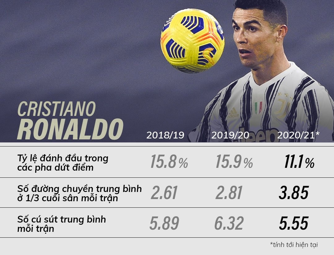 Trong 2 năm đầu tiên khoác áo Juventus, tỷ lệ đánh đầu trong các tình huống bắn phá khung thành đối thủ của CR7 lần lượt là 15,8 và 15,9%. Tới mùa 2020/21, thống kê này giảm xuống 11,1%.