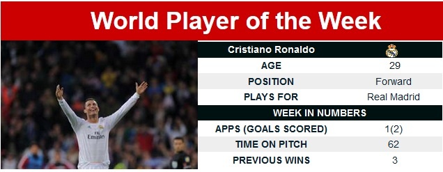 Với màn trình diễn đó, Ronaldo được trang Goal bầu chọn là cầu thủ xuất sắc nhất thế giới tuần qua. Để có được danh hiệu này, chủ nhân của Quả bóng vàng FIFA 2013 đã phải vượt qua những đối thủ nặng ký khác như Lionel Messi (Barcelona), Yaya Toure (Manchester City), Connor Wickham (Sunderland) và Yusuf Erdogan (Trabzonspor).