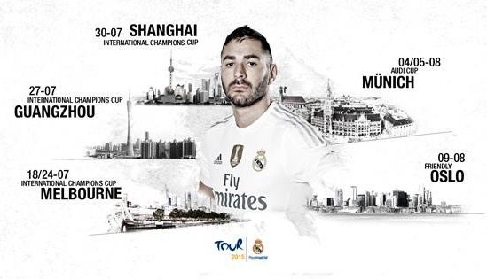 | Đối thủ đầu tiên của đội bóng Hoàng gia Tây Ban Nha tại International Champions Cup lần lượt là Roma (18/7, Melbourne), Manchester City (24/7, Melbourne), Inter Milan (27/7, Quảng Châu) và AC Milan (30/7, Thượng Hải). |
