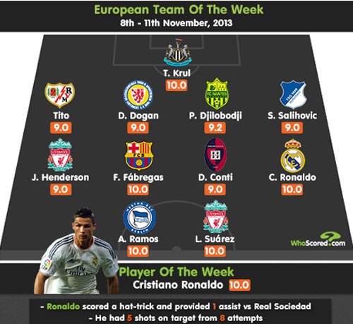 | Ronaldo là cầu thủ nổi bật nhất trong đội hình hay nhất châu Âu tuần qua: Lập hat-trick, có 1 pha kiến tạo và thực hiện 5 cú sút trúng mục tiêu. |