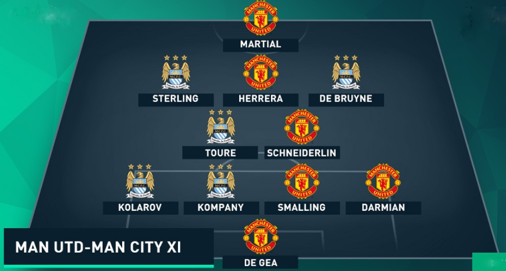 Anthony Martial (tiền đạo, MU): Trong bối cảnh Sergio Aguero của Man City vắng mặt do dính chấn thương, còn đồng đội Wayne Rooney không có phong độ tốt, Martial xứng đáng được lựa chọn cho vị trí trung phong trong đội hình kết hợp giữa MU và Man City. Từ lần đầu chơi cho “Quỷ đỏ” Manchester ở trận gặp Liverpool, chân sút người Pháp đã ghi 3 bàn và có 1 pha kiến tạo sau 5 trận khoác áo MU tại Premier League.