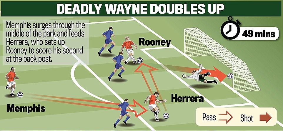 Memphis Depay là người khởi nguồn cho bàn thắng thứ 2. Ngôi sao người Hà Lan chuyền cho Herrera để cựu cầu thủ Bilbao kiến tạo cho Rooney lập công.