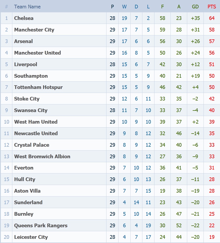 Bảng xếp hạng Ngoại hạng Anh sau vòng 29