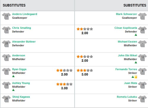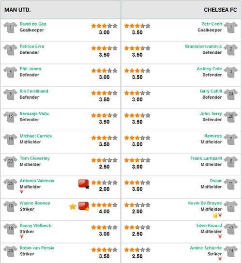 Trong khi đó, cầu thủ nhận điểm thấp nhất trận trong đội hình ra sân của Quỷ đỏ là Antonio Valencia. Những pha lên bóng bên cánh phải do tiền vệ người Ecuador phụ trách không mang đến kết quả như mong đợi. Đối đầu với Ashley Cole bên phía Chelsea, cầu thủ khoác áo số 25 của MU hoàn toàn bị bắt bài. Những pha chuyền vào của Valencia đều không vượt qua được Ashley Cole. Sau trận đấu, Antonio Valencia chỉ nhận được điểm 2/5.