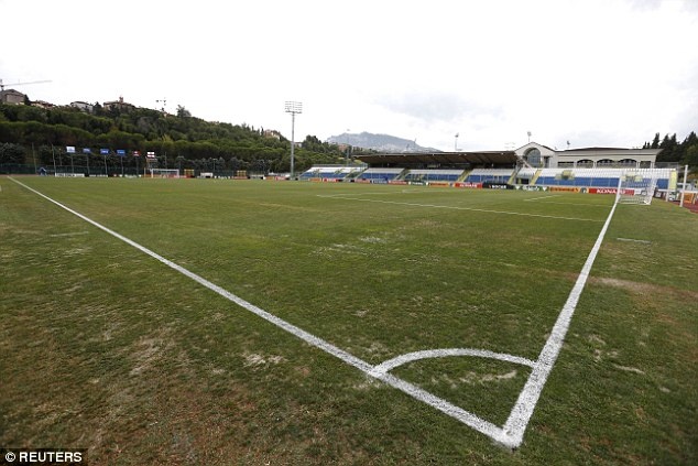 | Các tuyển thủ Anh không hài lòng với mặt sân được ví như "ruộng trồng khoai tây" ở Olimpico di Serravalle. Một số chỗ trên sân xuống cấp nghiêm trọng. |