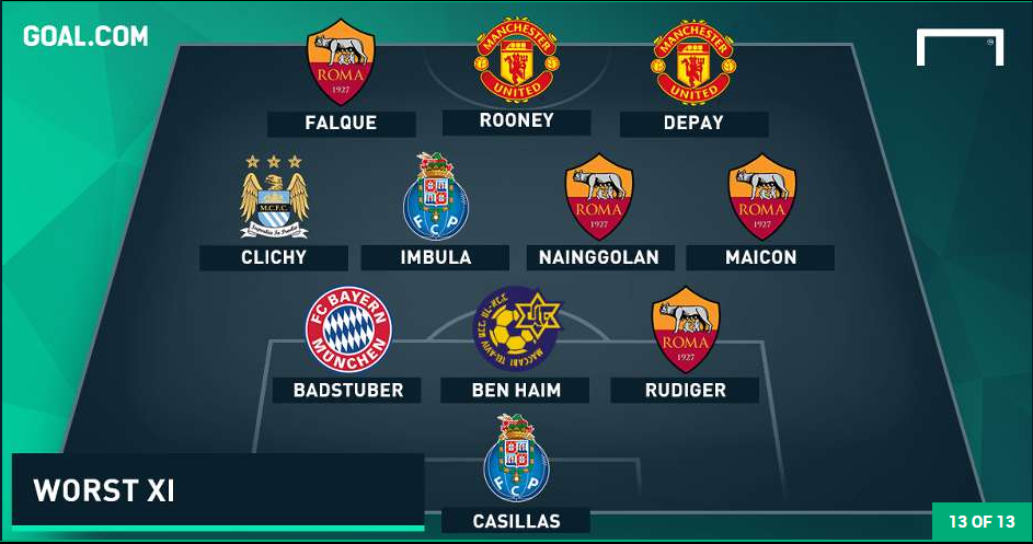 Trong đội hình tệ nhất lượt trận thứ 5 vòng bảng Champions League do Goal bình chọn theo sơ đồ 3-4-3, Rooney và Casillas là những cái tên nổi tiếng nhất góp mặt.