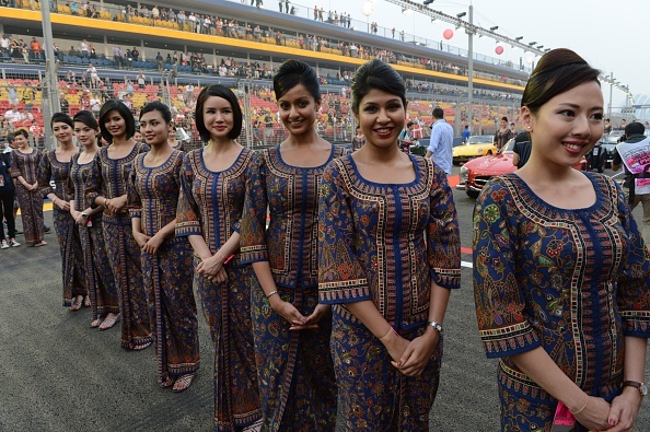 | Dàn grid girl xinh đẹp trong trang phục truyền thống của hãng hàng không Singapore Airlines. Ở mùa giải năm nay, Singapore Airlines chính thức thế chân Singtel để trở thành thành nhà tài trợ chính cho chặng đua F1 tại đảo quốc sư tử. |