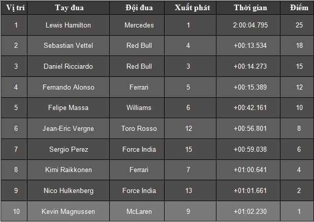 | Dẫu vậy, chỉ 2 vòng sau đó, Hamilton dễ dàng đòi lại ngôi đầu nhờ bộ lốp mới tốt hơn hẳn. Ngôi sao của Mercedes cũng là người cán đích đầu tiên sau 60 vòng đua với thời gian 2 giờ 0 phút 4,795 giây. |