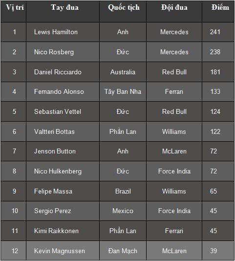 *Bảng xếp hạng mùa giải 2014 sau chặng Singapore GP