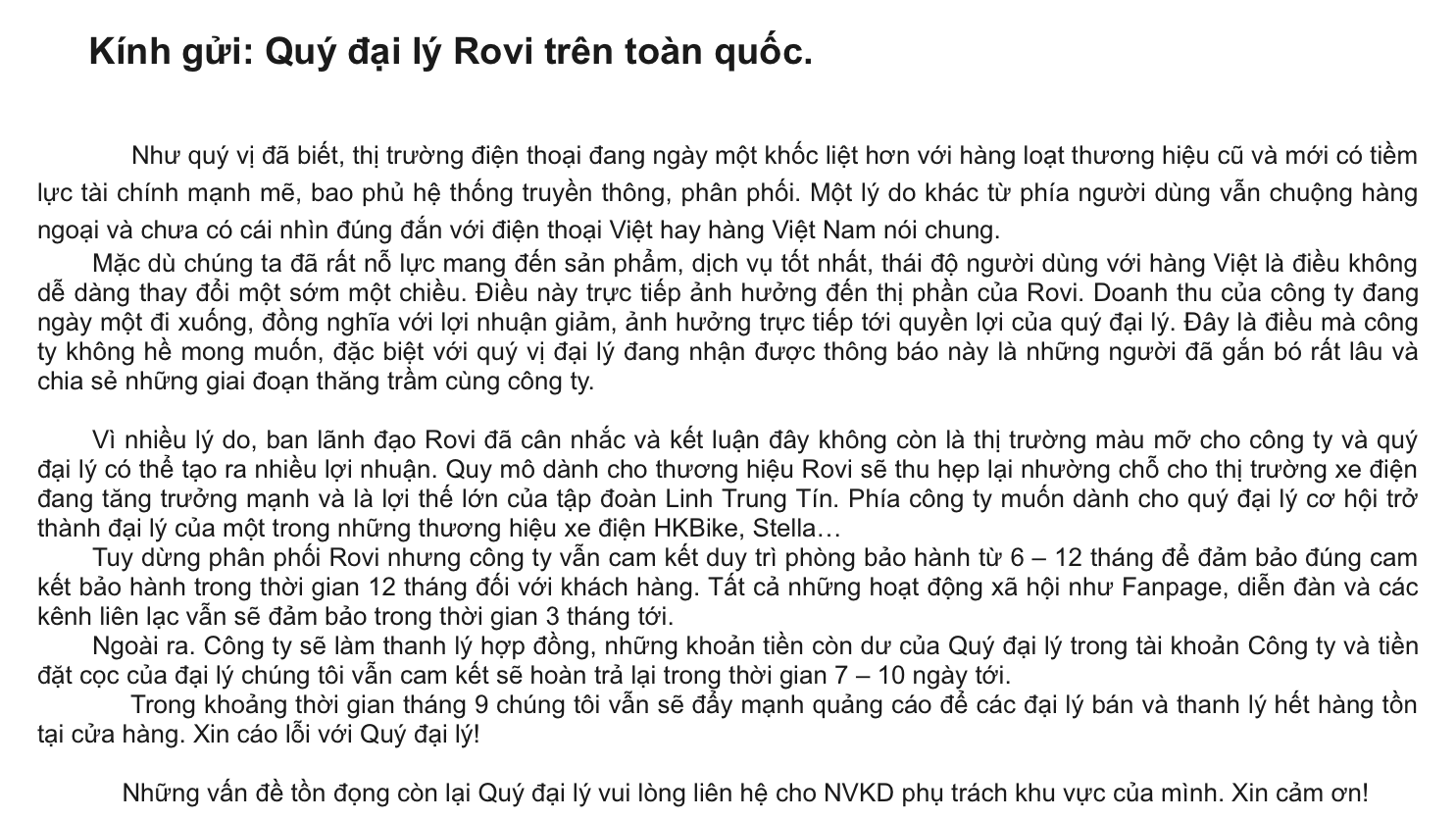 Theo nguồn tin của Zing.vn, trong một email gửi đến các đại lý, Rovi (trước đây là HKPhone) cho biết công ty đang gặp khó khăn từ nhiều phía, doanh số và thị phần giảm sâu. Do đó, công ty này sẽ ngừng phân phối smartphone để tập trung hơn vào mảng kinh doanh xe điện.