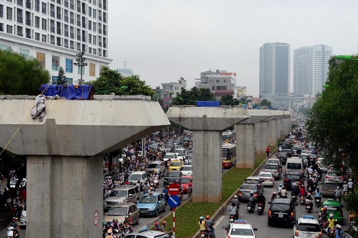 | Ùn tắc kéo dài lên tới cầu vượt Ngã Tư Sở cách đó vài trăm mét. CSGT phải dùng xe tải ngăn lối rẽ cấm ô tô quay đầu. |