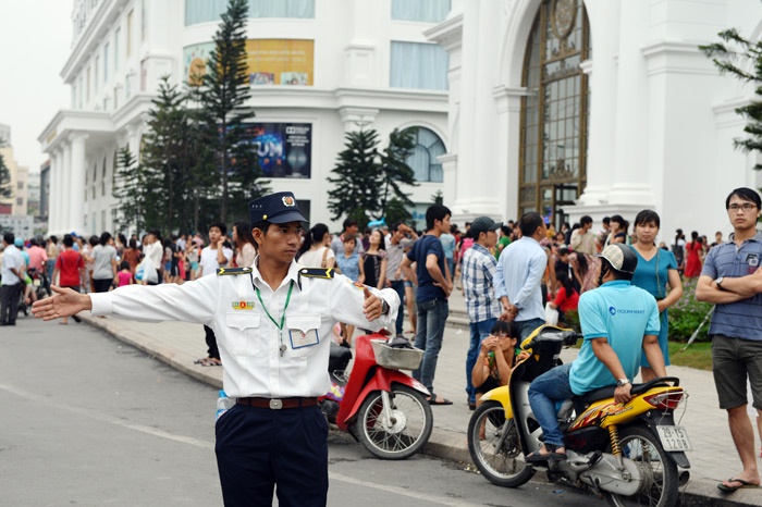 Nhân viên bảo vệ vất vả điều khiển phương tiện ra vào.