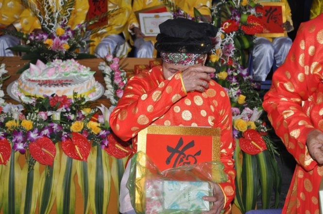 Có những người con năm nay gần 50 tuổi, một phần tóc đã bạc, lần đầu được làm lễ rửa chân, tay cho cha, mẹ đã xúc động rơi nước mắt. Ở trên ghế, những người cha, mẹ cũng cảm động không kìm được nước mắt. Nếu bậc cha, mẹ nào có con trai, con gái đi làm ở xa thì con dâu, con rể, hoặc cháu nội, cháu ngoại sẽ rửa chân, tay báo hiếu.