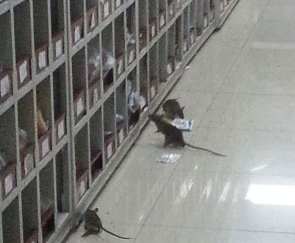 Một hiệu thuốc trong bệnh viện ở Thành Đô, Tứ Xuyên, Trung Quốc khiến mọi người phát hoảng vì chuột tràn ngập, leo vào tủ thuốc.