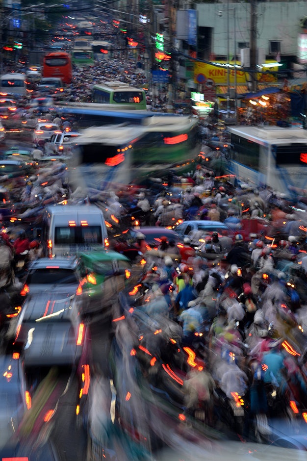 17h dòng xe cộ bắt đầu đổ về con đường Xô Viết Nghệ Tĩnh với tốc độ chậm như đi bộ. Sau đó 1 giờ, xe kẹt nghiêm trọng khiến các phương tiện không thể di chuyển. |