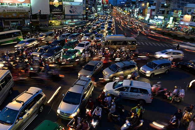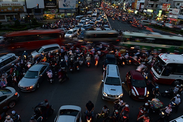| Dòng xe rối loạn vượt qua ngã tư. |