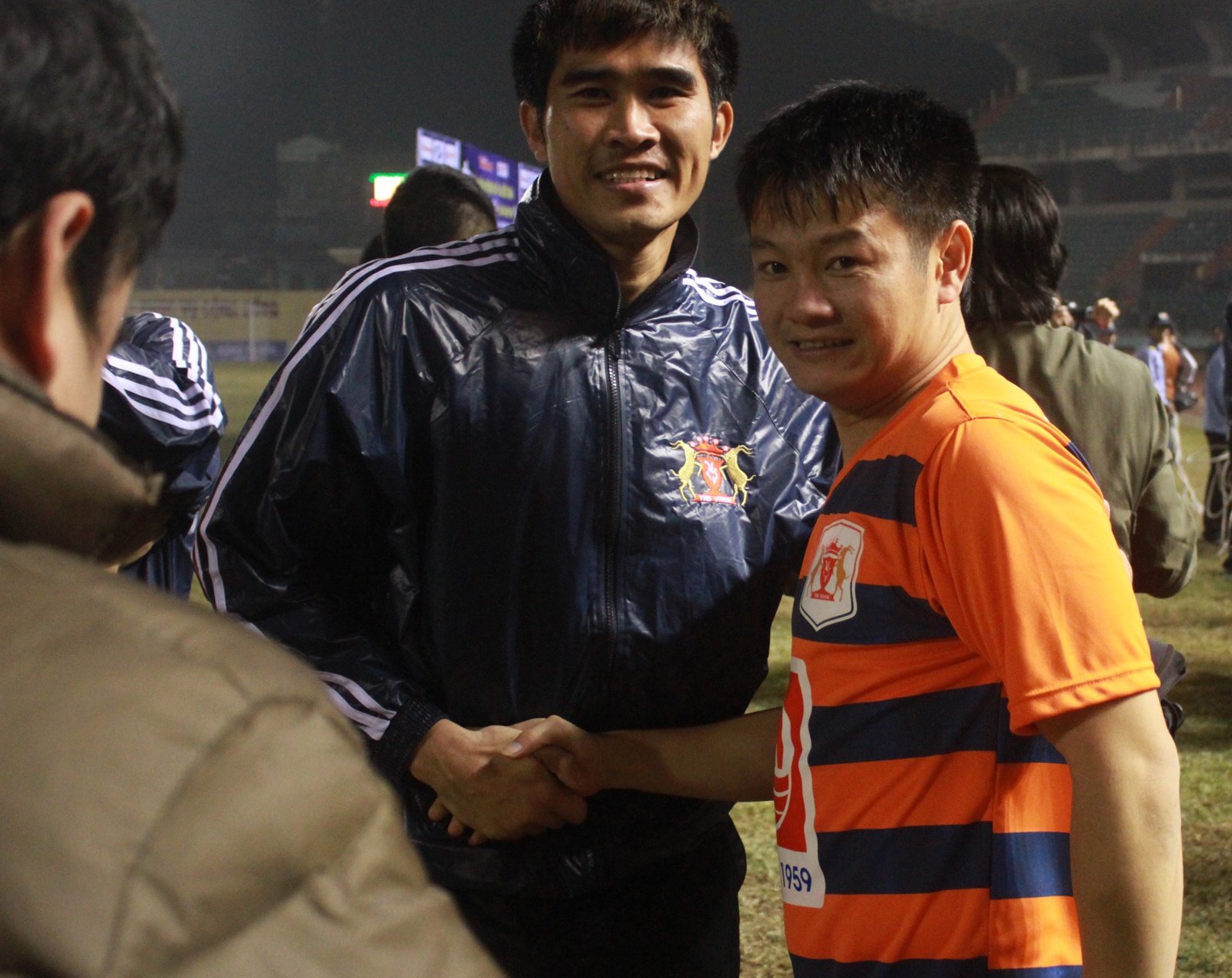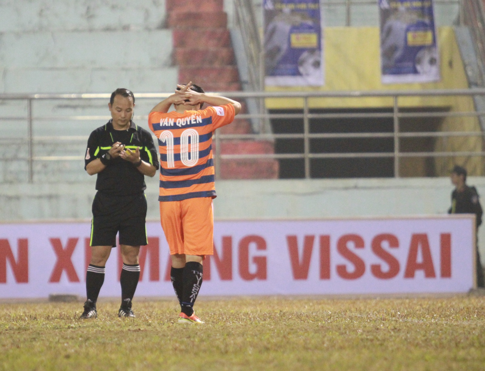 | HLV Văn Sỹ tính tận dụng khả năng đá phạt của Văn Quyến ở loạt sút penalty. Đáng tiếc, thần đồng một thời của bóng đá Việt Nam đã thực hiện hỏng quả đá đầu tiên của đội nhà. Anh đánh bại được thủ thành Hồng Sơn nhưng bóng lại dội cột dọc đi ra ngoài. |