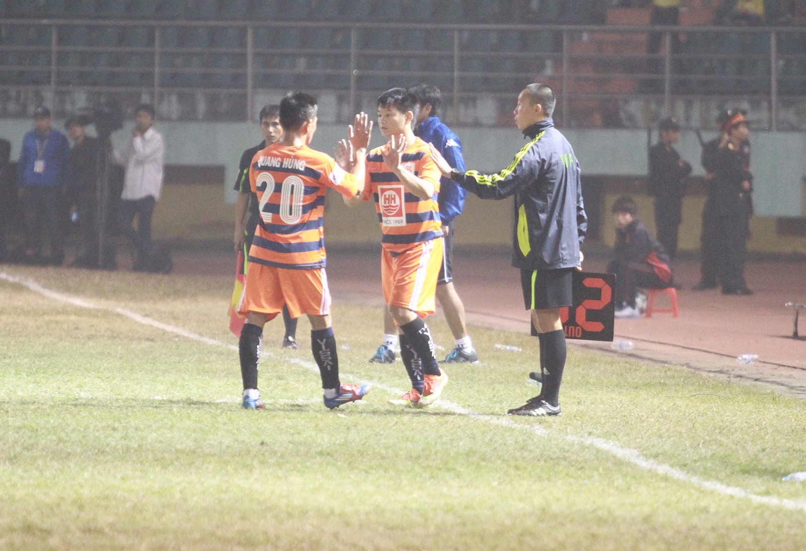| Tuy nhiên, tới khi trận đấu bước sang phút bù giờ thứ 3, HLV Văn Sỹ mới tung Văn Quyến vào sân thay Quang Hùng. |