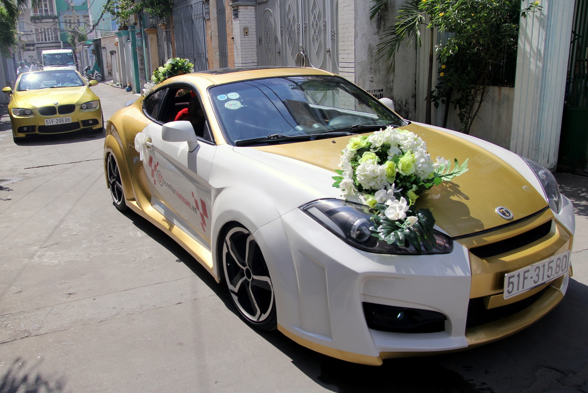 | Đám rước dâu có sự xuất hiện của hàng loạt môtô và hai chiếc xe hơi thể thao vừa diễn ra sáng 21/11 tại TP HCM. Dẫn đầu là xe hoa hiệu Hyundai Tuscani. Đây là dòng xe thể thao hai cửa, bốn chỗ ngồi do Hàn Quốc sản xuất. Xe được độ dàn áo khá độc đáo cùng nước sơn hai tông màu. |