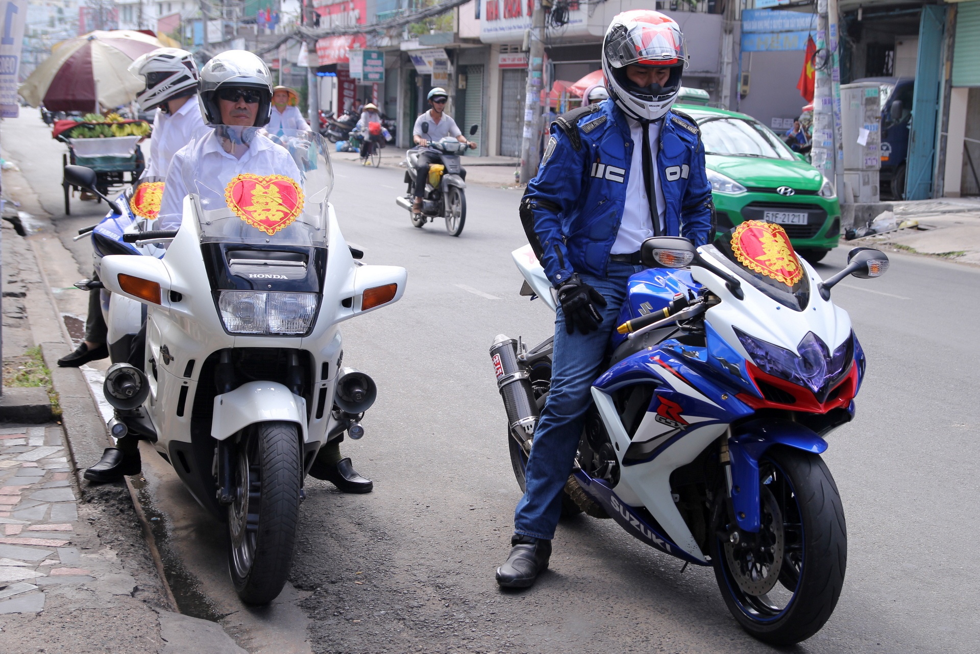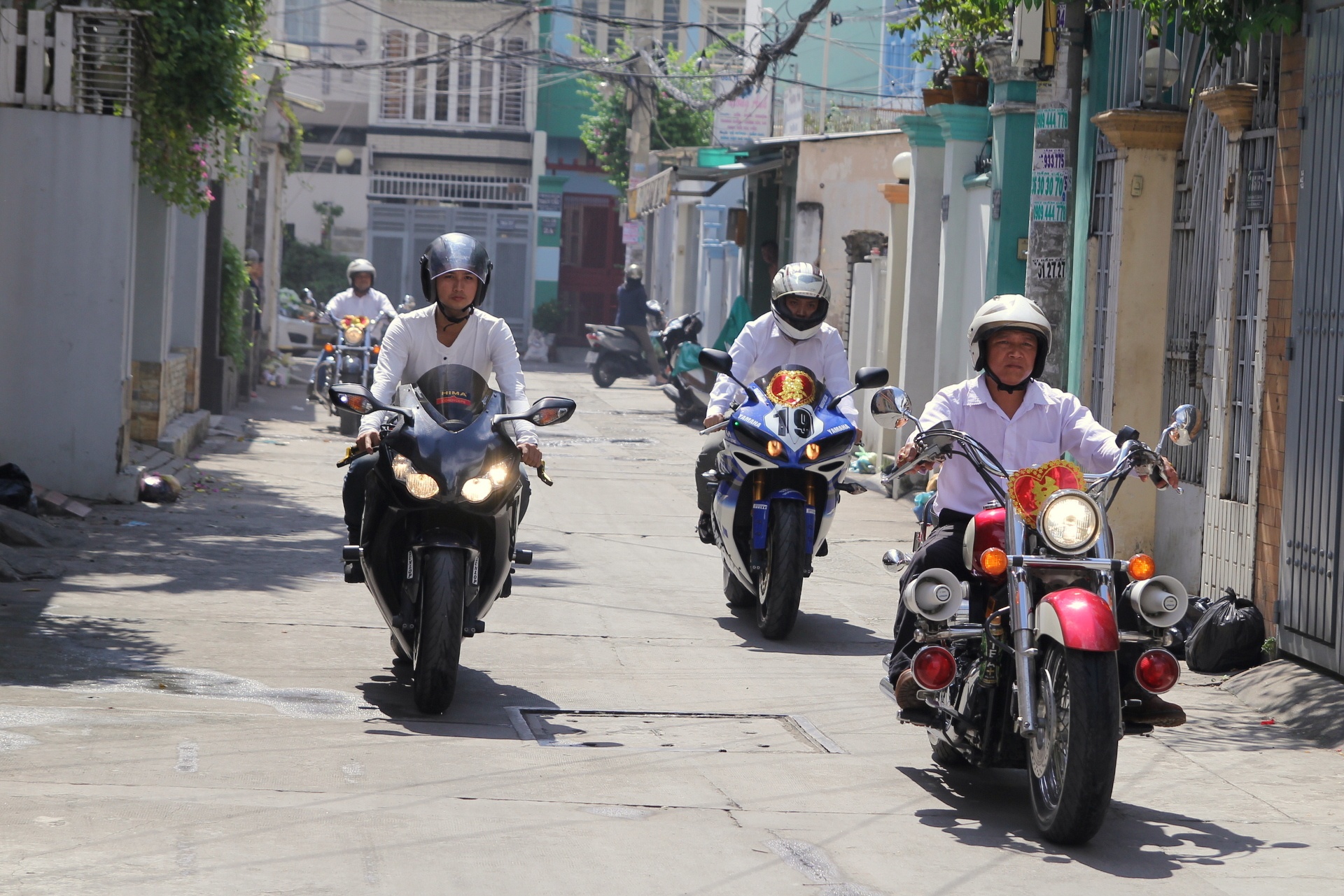 | Đoàn rước dâu gồm gần 20 chiếc môtô đủ chủng loại. Cả cô dâu và chú rể đều là những người đam mê môtô nên trong ngày trọng đại có nhiều bạn bè trong nhóm tới tham gia. |