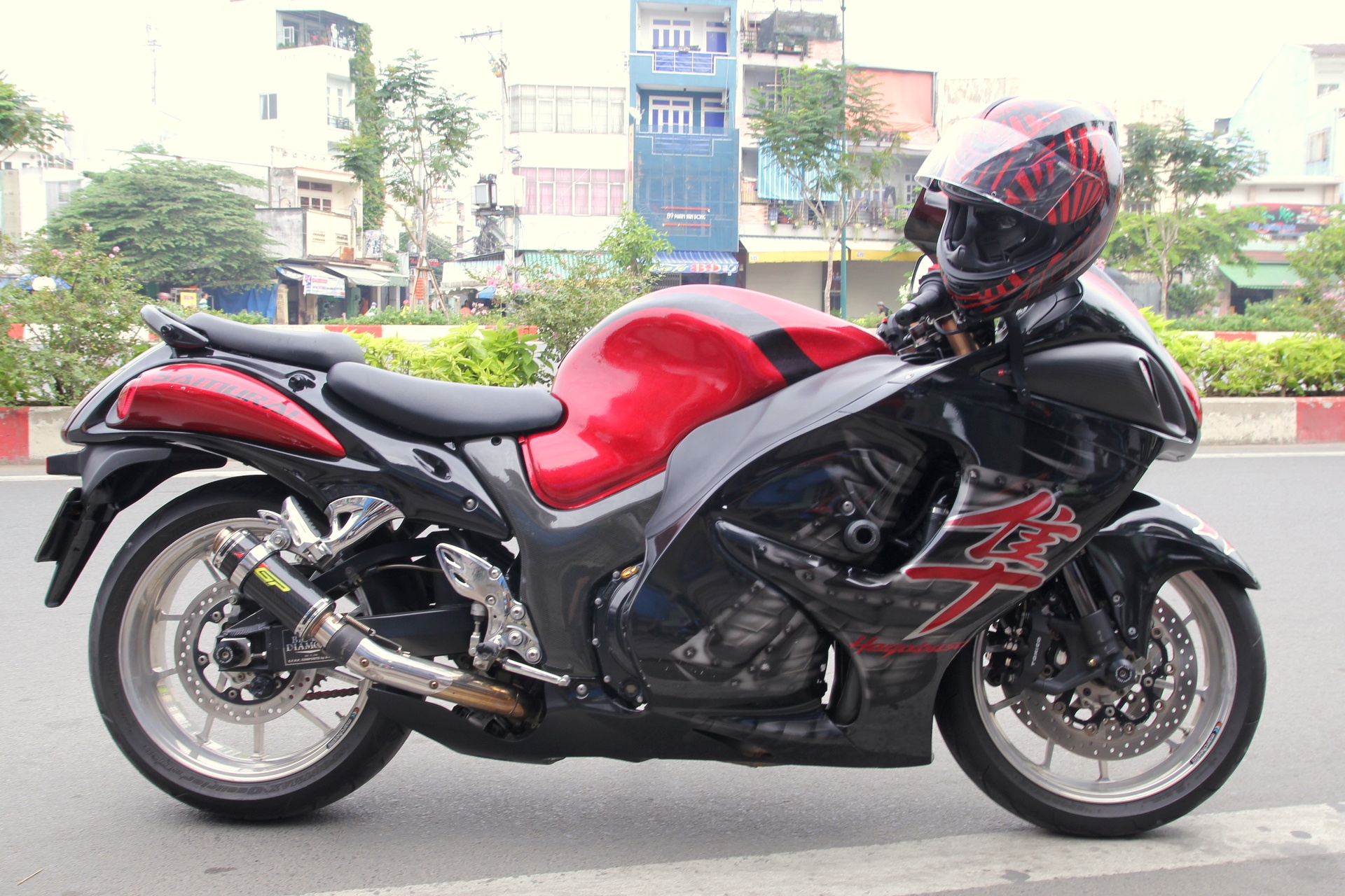 | "Chim ưng" Suzuki Hayabusa của nữ biker "Ớt Hiểm" được sơn airbrush dàn áo và độ ống pô. Đây là một trong những chiếc môtô dân dụng nhanh nhất trên thế giới. |