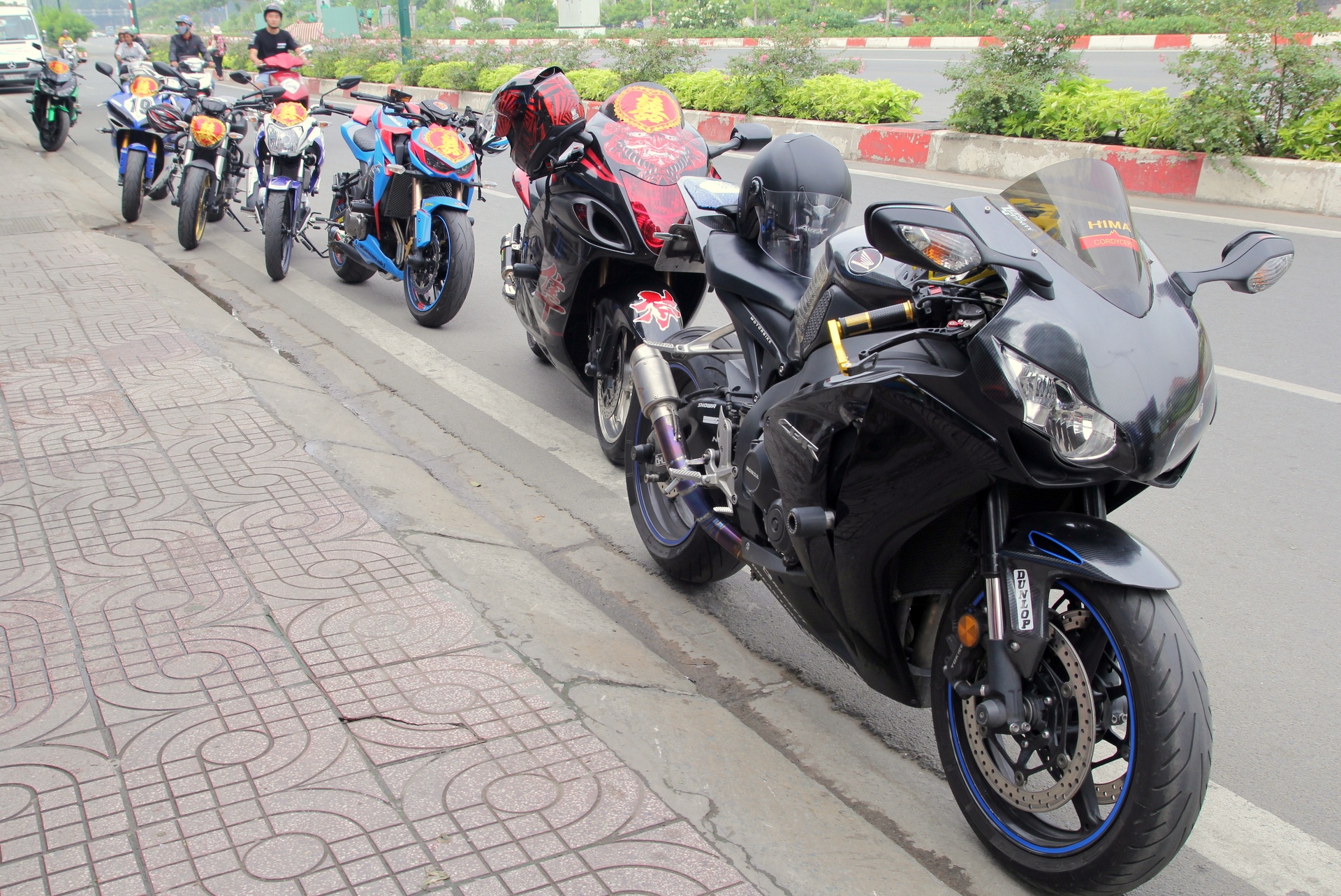| Những chiếc xe thể thao được xếp bên đường. Dẫn đầu là Honda CBR 1000RR được độ dàn áo, pô và gắn vài món đồ chơi. |