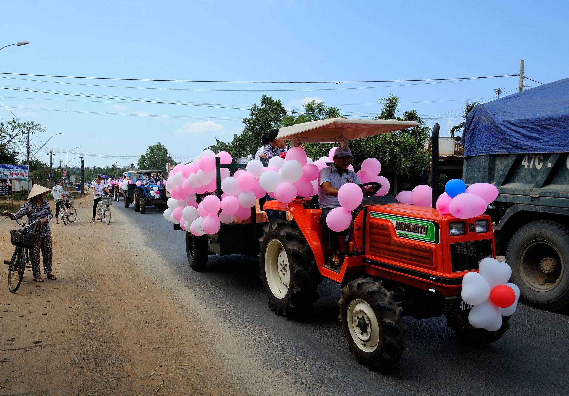 | Huy cùng những người bạn của mình gắn hơn 1.000 quả bóng bay lên những chiếc máy cày. Dàn xe rước dâu độc đáo này được huy động từ hàng xóm và gia đình chú rể. |