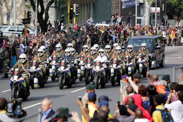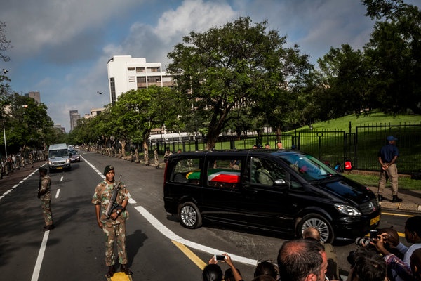 Binh sĩ vũ trang bảo vệ đoàn xe chở linh cữu cố tổng thống Mandela tiến vào Union Buildings ở thủ đô Pretoria. Ảnh: NY Times. |