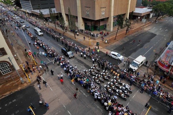 Nhằm đảm bảo an ninh cho đoàn xe chở linh cữu cố tổng thống Mandela, giới chức Nam Phi phải huy động lực lượng lớn nhân viên an ninh. Người ta dựng rào sắt để ngăn người dân ùa vào đoàn xe chở linh cữu. Ảnh: NY Times. |
