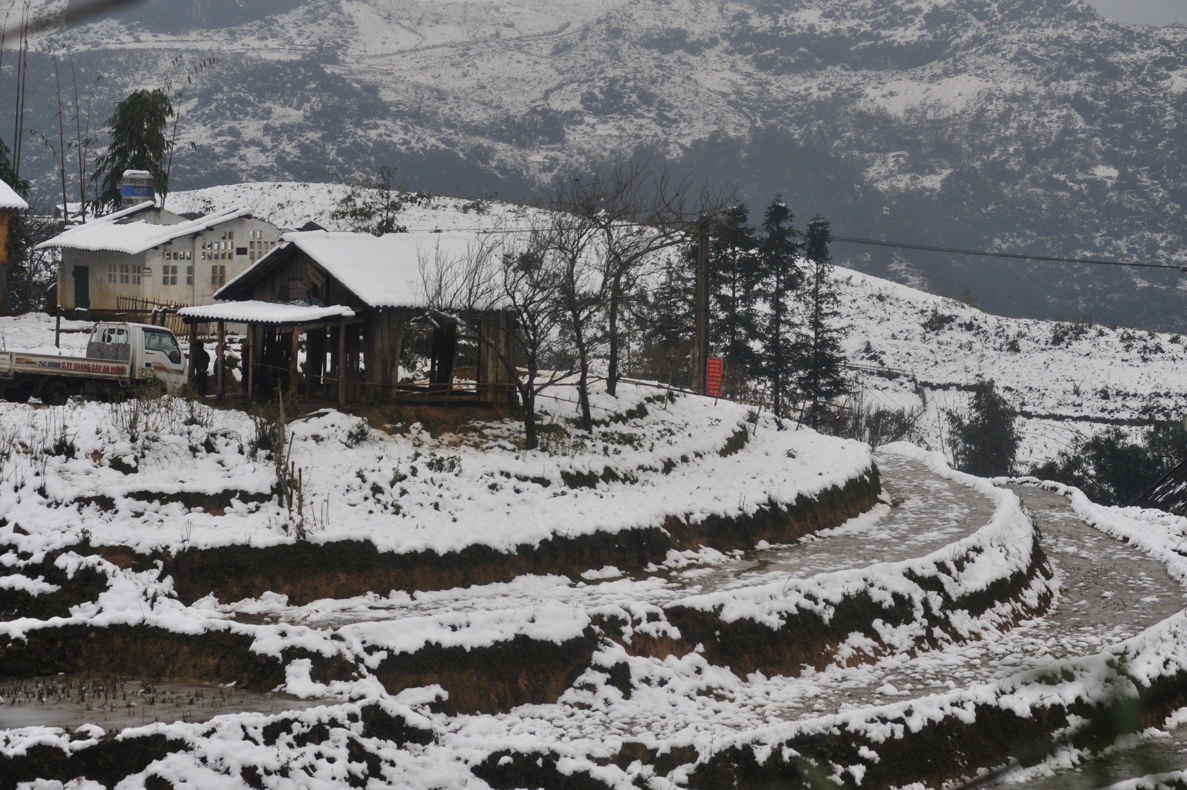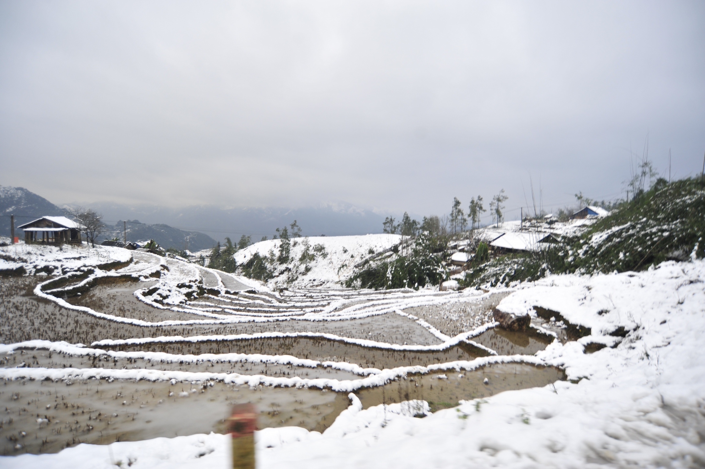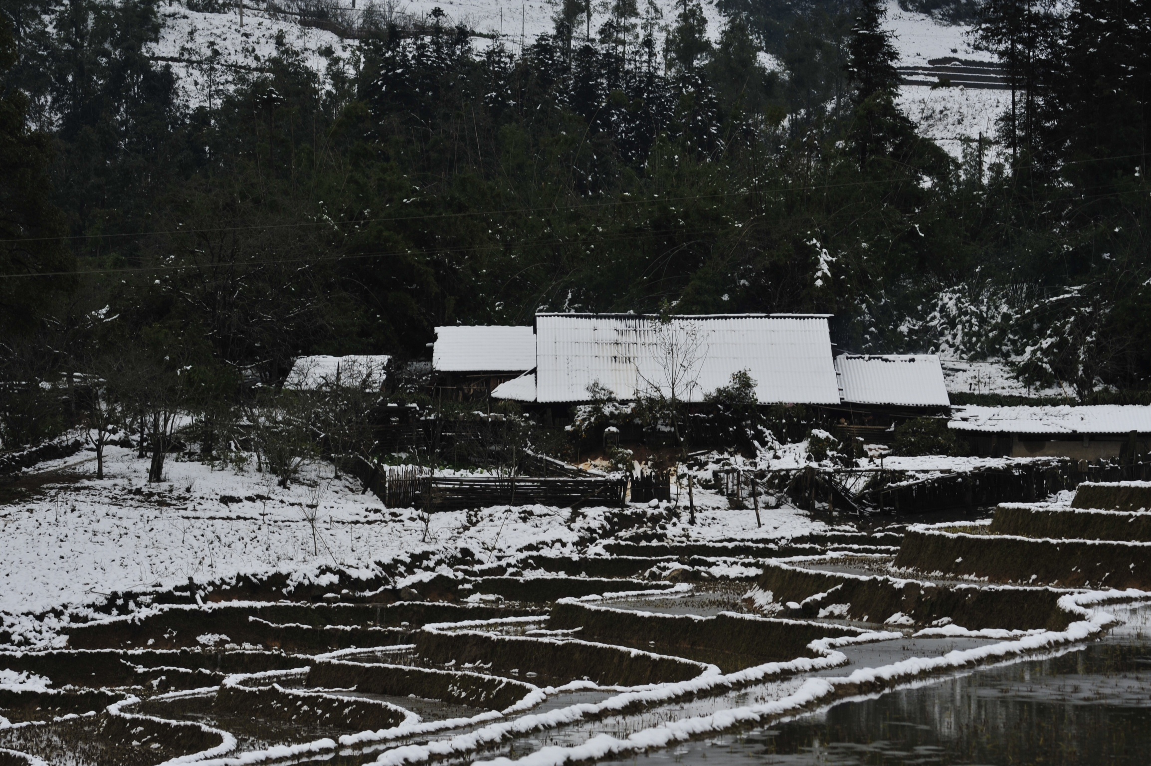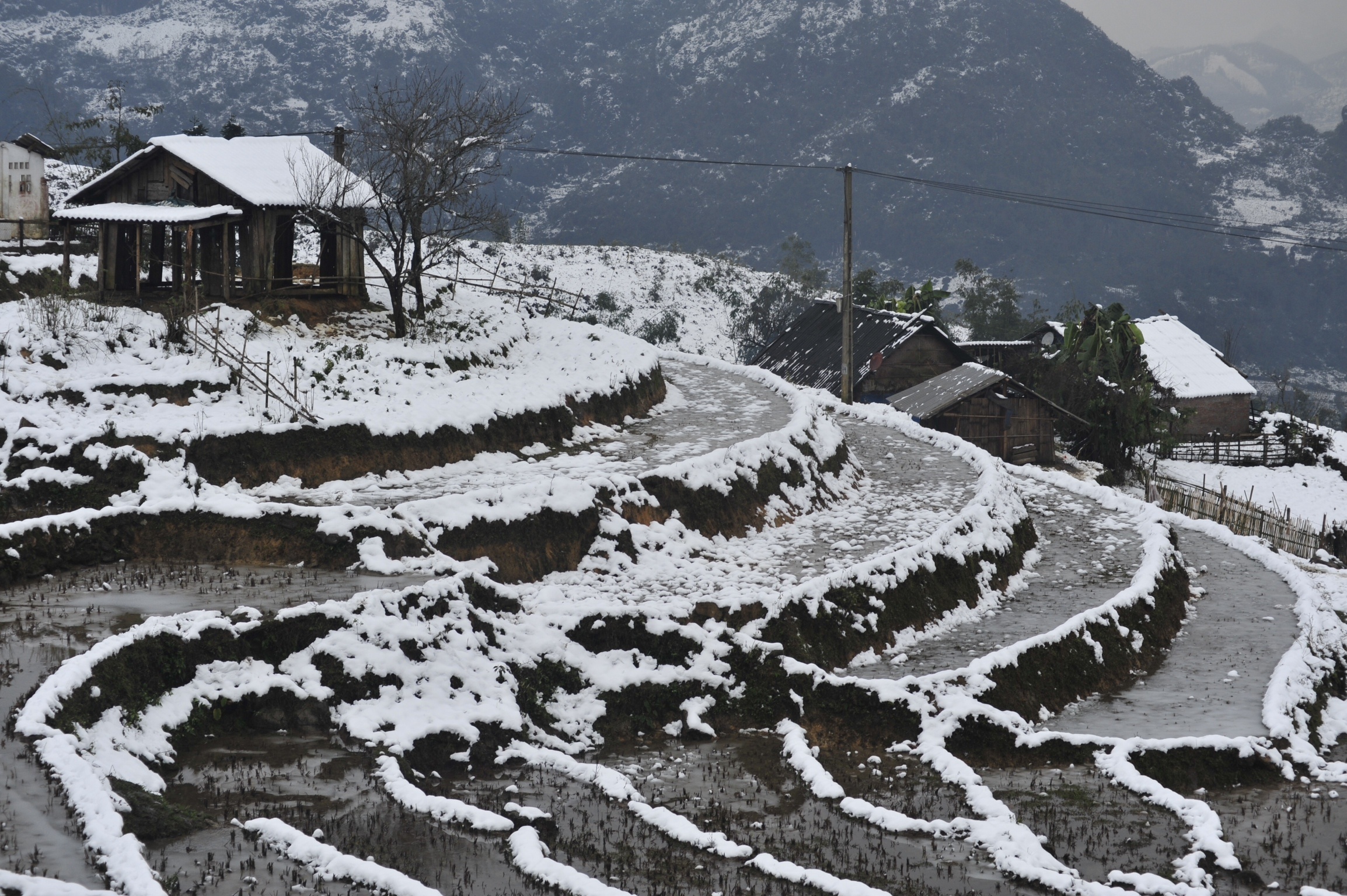 | Hầu hết nước tại các ruộng bậc thang đều đóng băng, cây cối, mái nhà và cảnh vật chìm trong màu trắng của băng tuyết. |