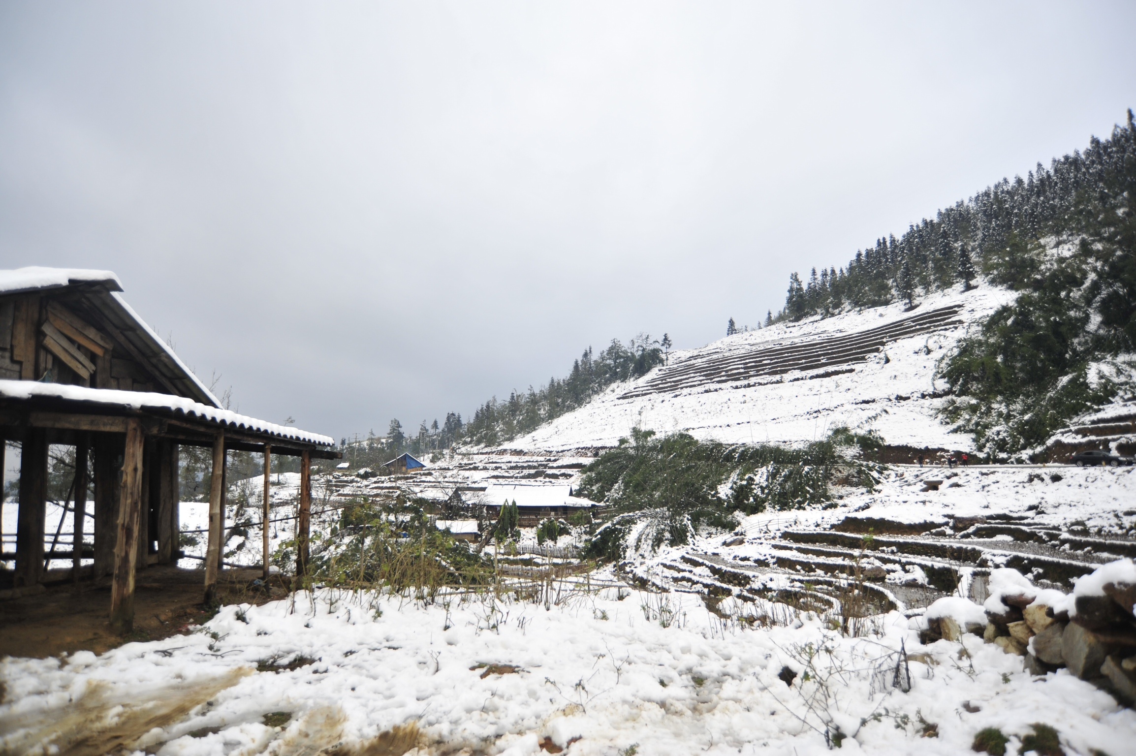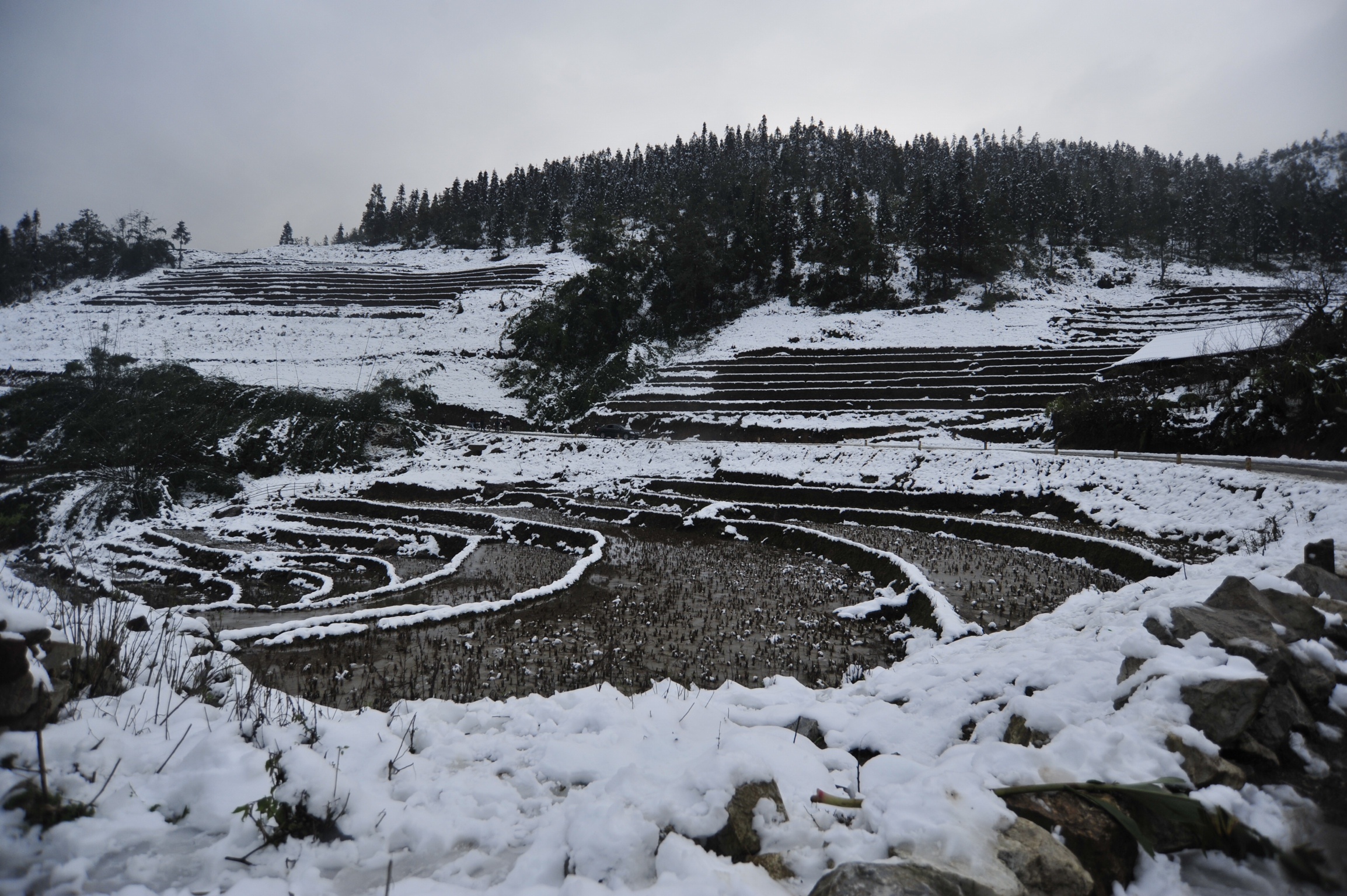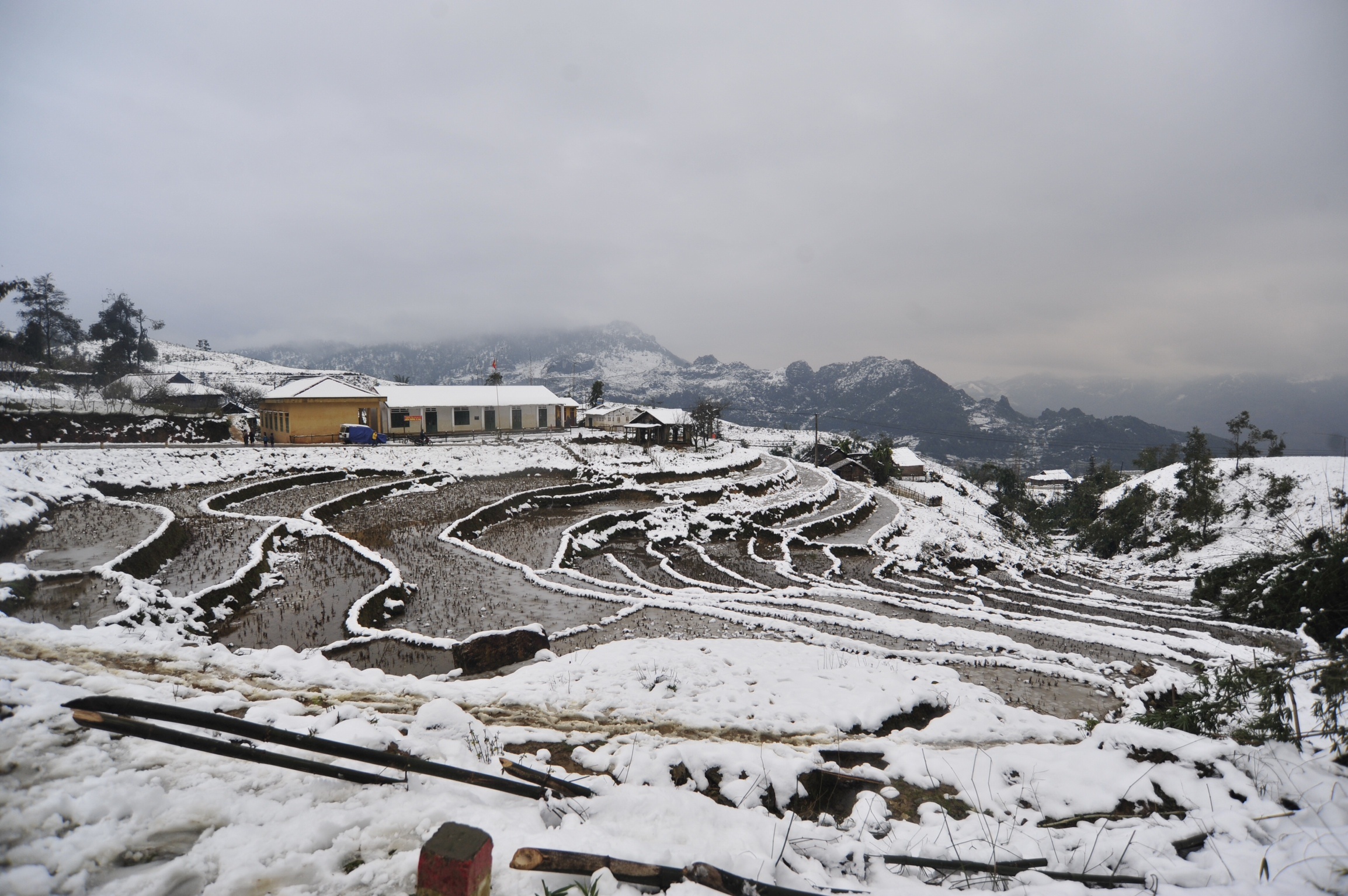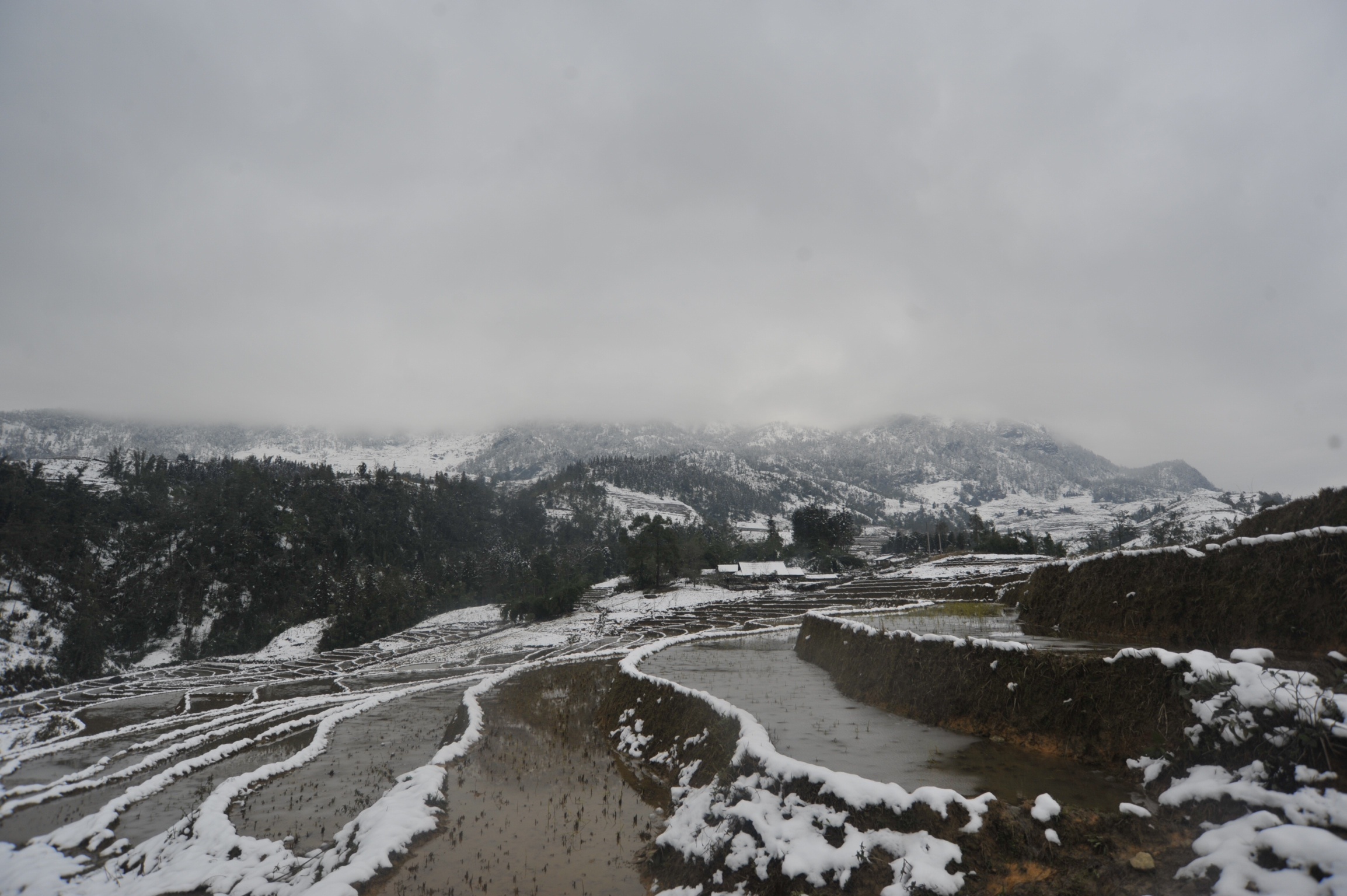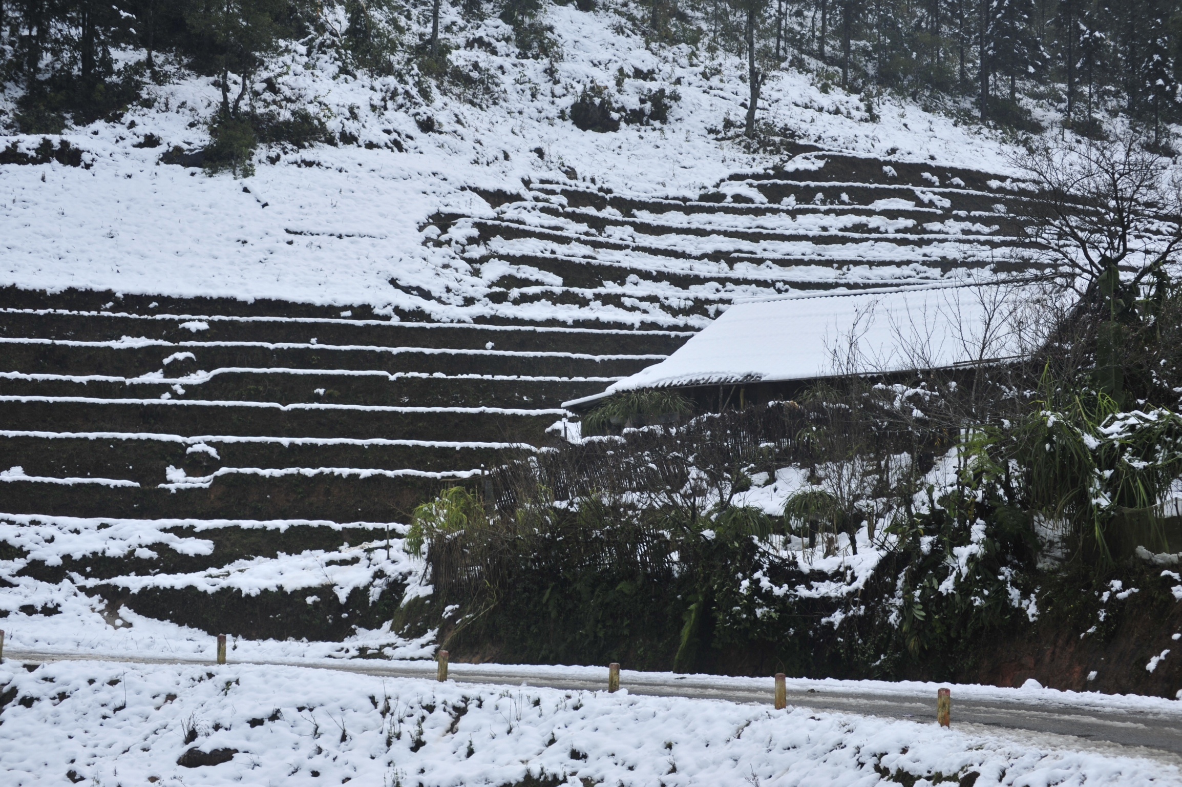 | Hầu hết nước tại các ruộng bậc thang đều đóng băng, cây cối, mái nhà và cảnh vật chìm trong màu trắng của băng tuyết. |