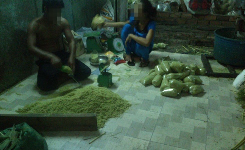 Chúng tôi tiếp tục tìm đến vựa của ông T. ở chân cầu vượt Gò Dưa, cơ sở này được làm từ những miếng ván ép tuềnh toàng, ở khu chứa sả mặt sàn luôn ẩm ướt, chỉ cách nhà vệ sinh khoảng 5 mét. Lúc chúng tôi đến, vựa ông T. có 5 công nhân nam đang cởi trần, một người đứng máy bào lá sả, những người khác trộn thuốc, đóng gói, vận chuyển, vô tư mang dép giẫm lên đống sả xay đang chờ đóng gói. Họ hút thuốc vô tội vạ khiến tàn và đầu lọc văng khắp nơi, lẫn cả vào sả xay.