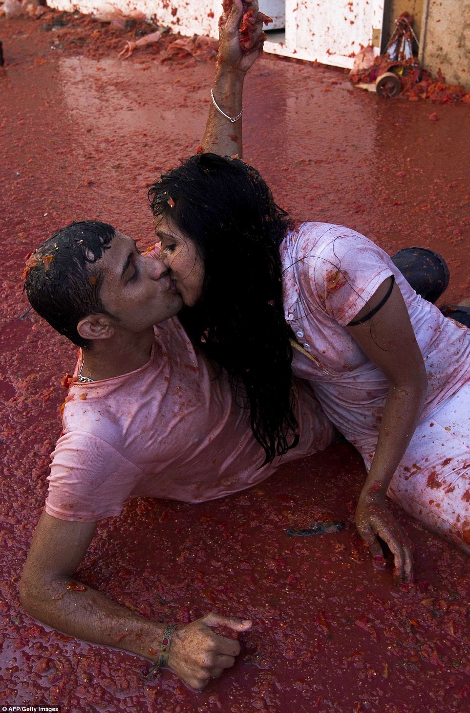 | Mọi người ném cà chua vào nhau và vào những xe tải chở đầy cả chua ùn ùn đổ về thị trấn. |