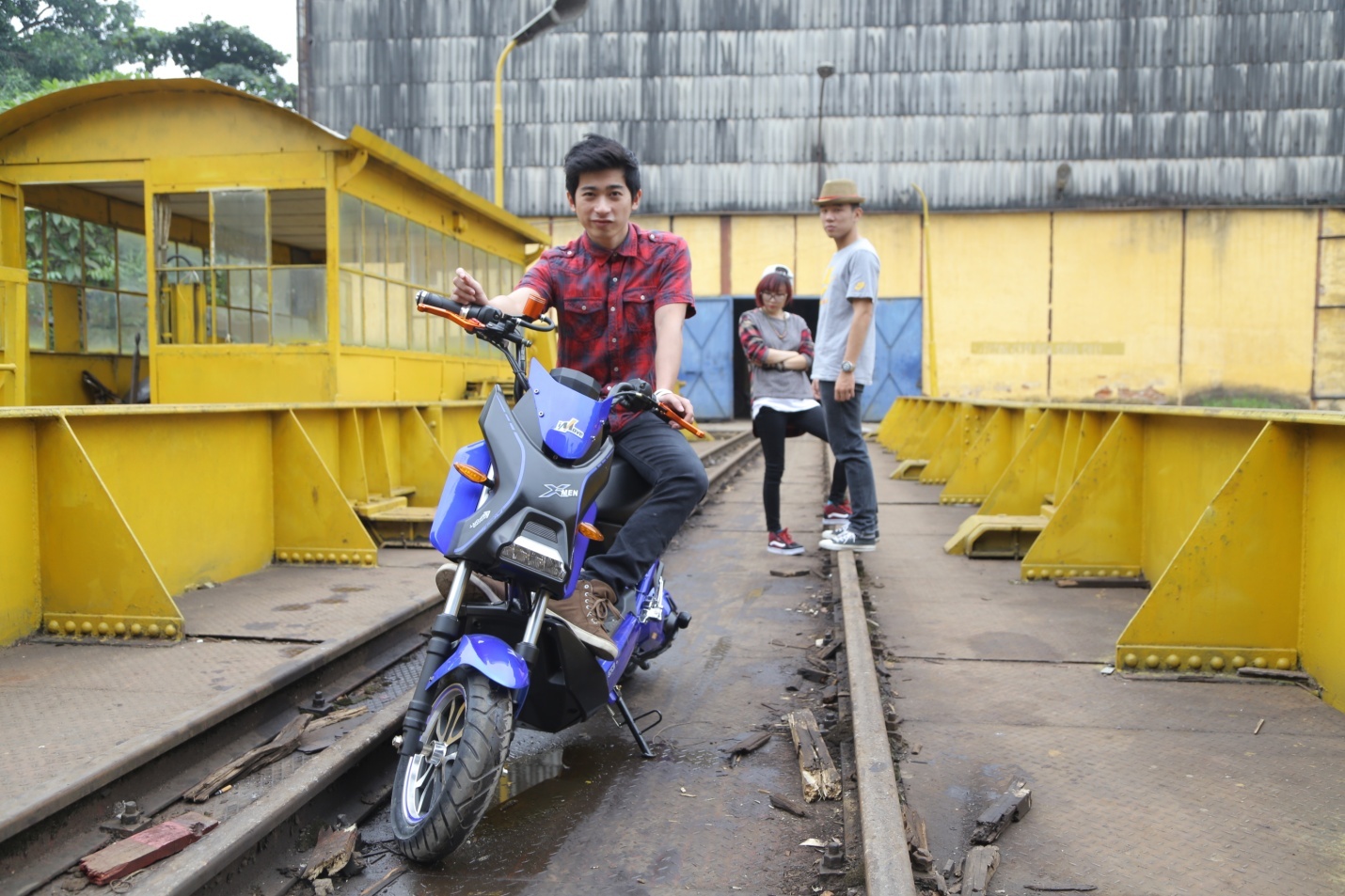 | Cô bạn mạnh mẽ theo phong cách tomboy bên chiếc xe điện màu xanh biển. |
