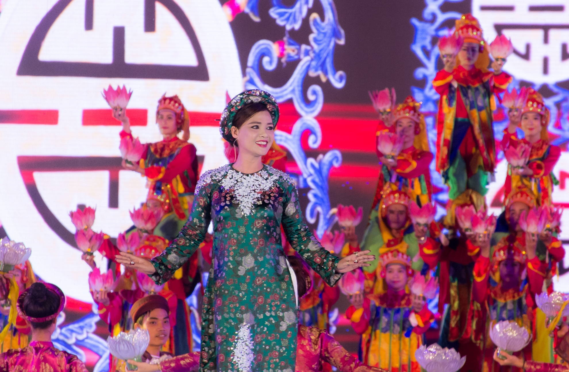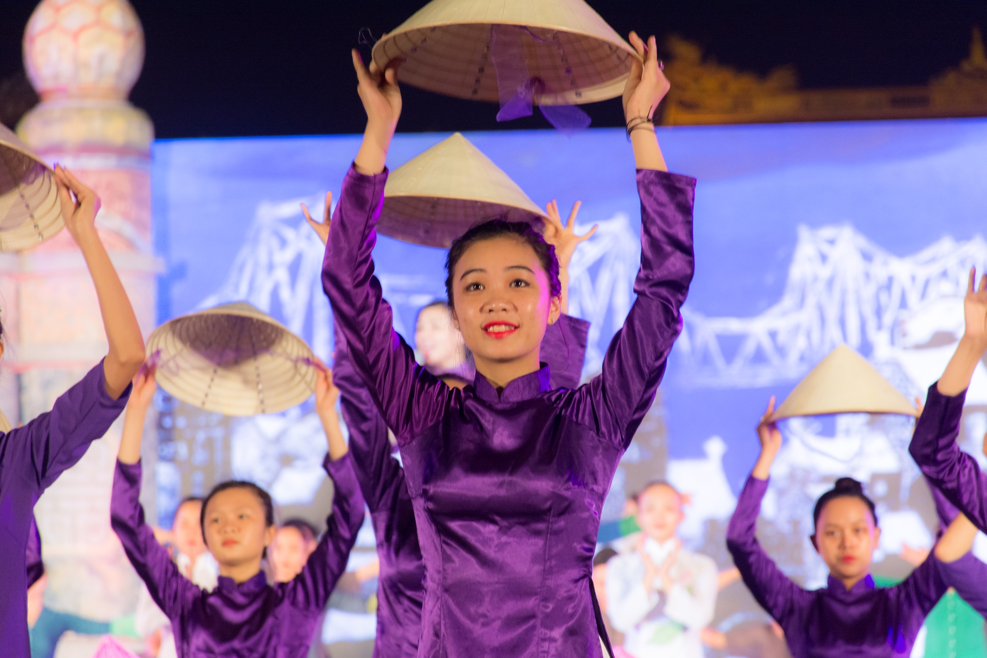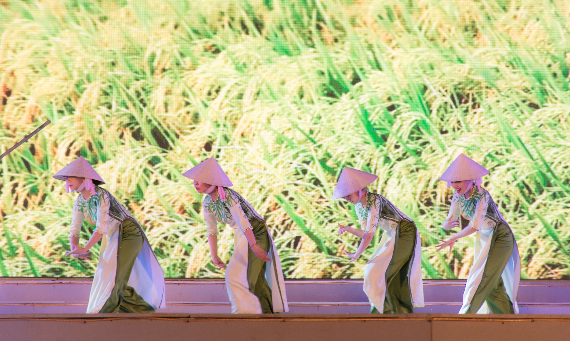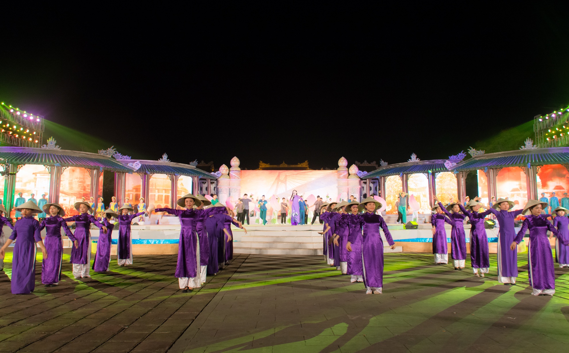 | Điểm nhấn của đêm khai mạc là các chương trình nghệ thuật đều tái hiện các nền văn hóa 3 miền. Trong ảnh là tiết mục biểu diễn trang phục áo dài nón lá của phụ nữ Việt Nam. |
