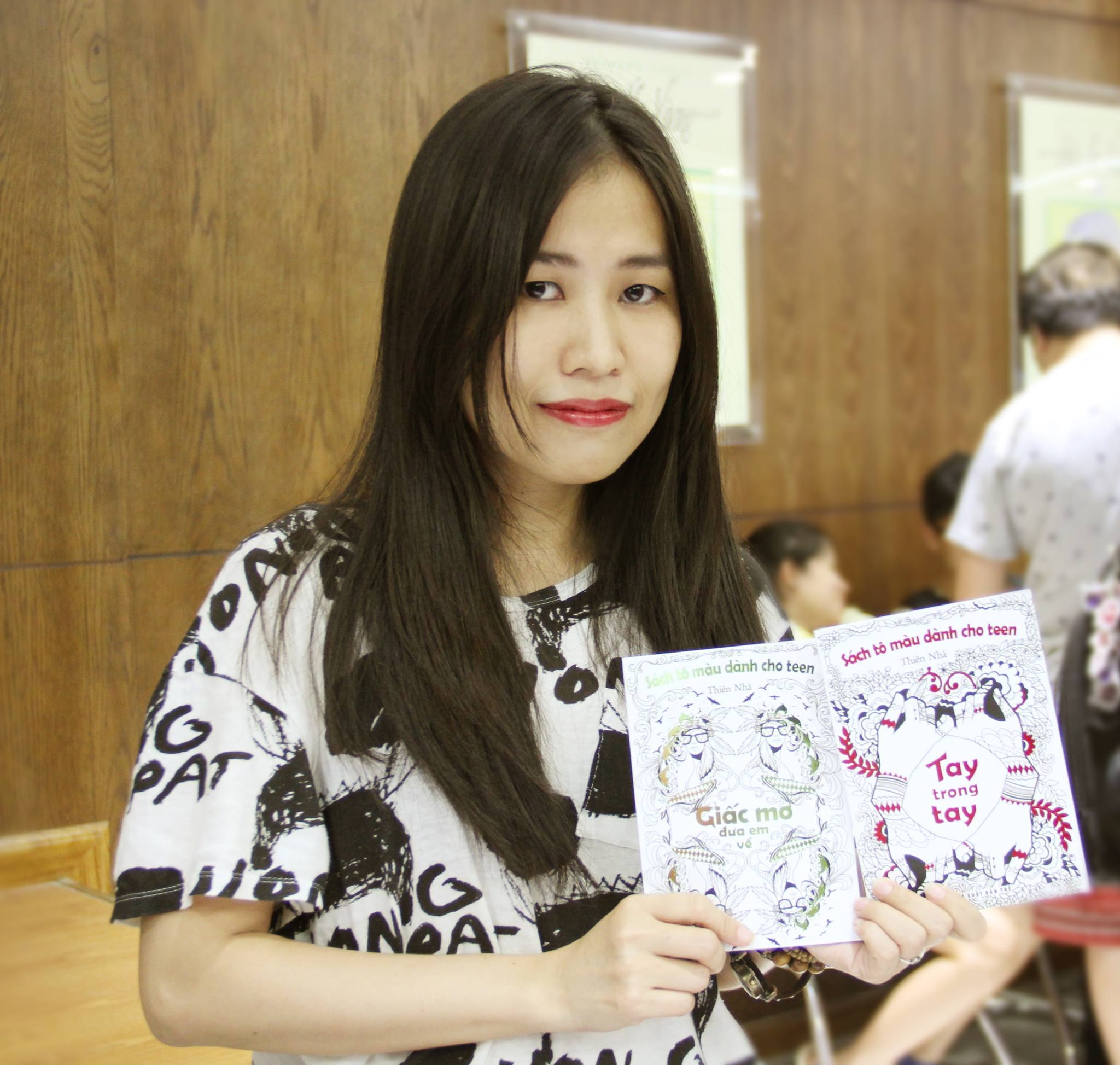 | Tác giả Thiên NHã và 2 cuốn sách tô màu của cô. |