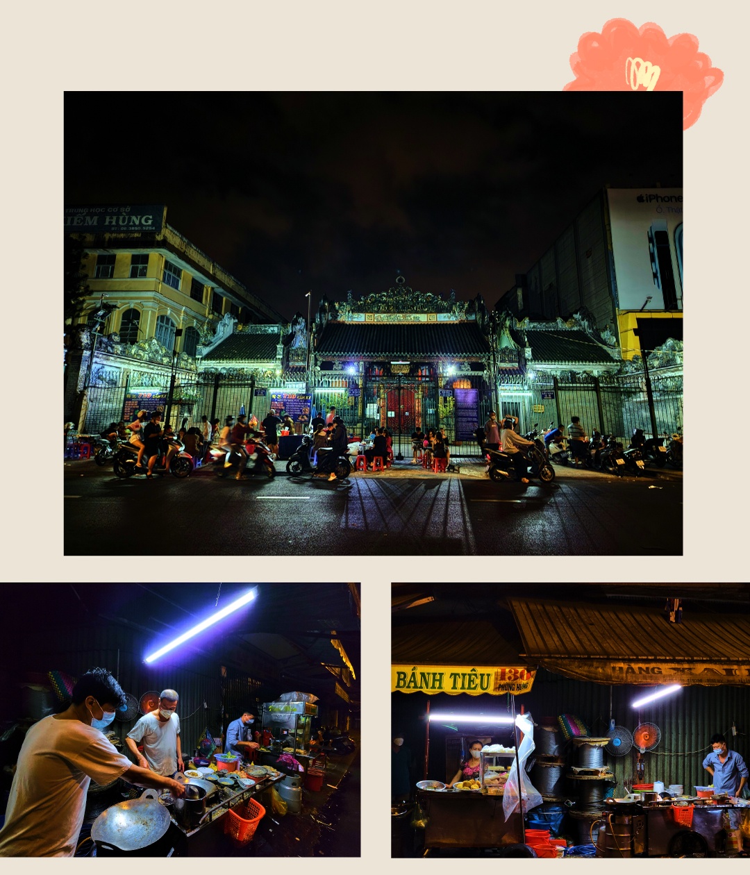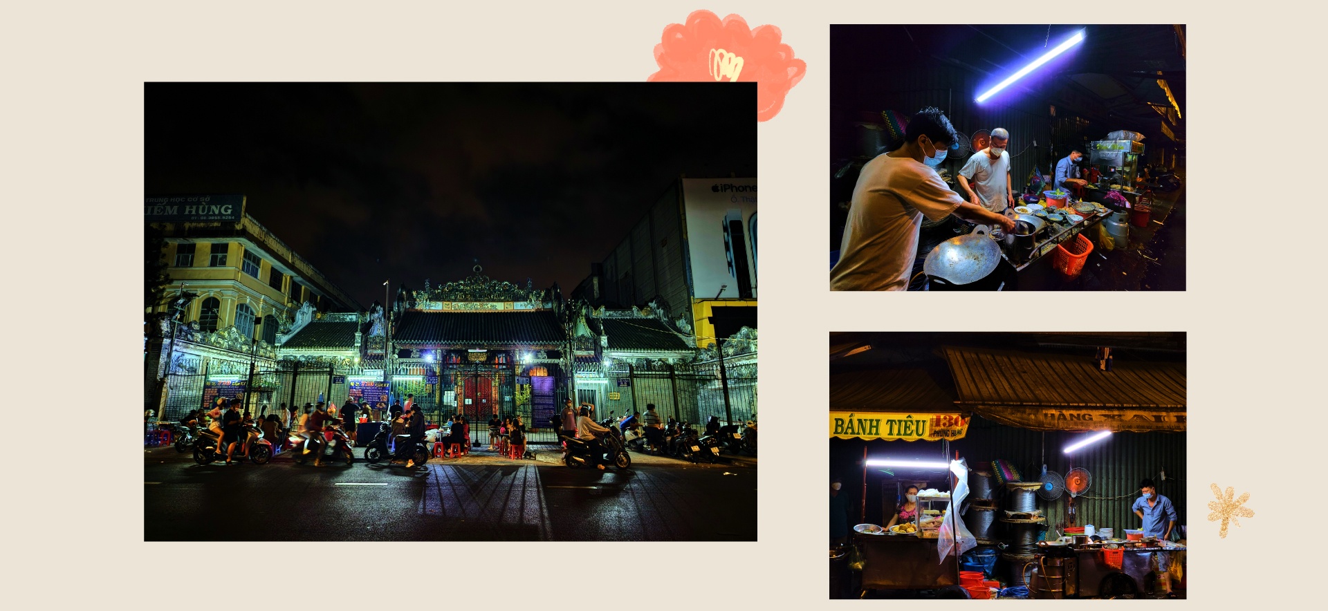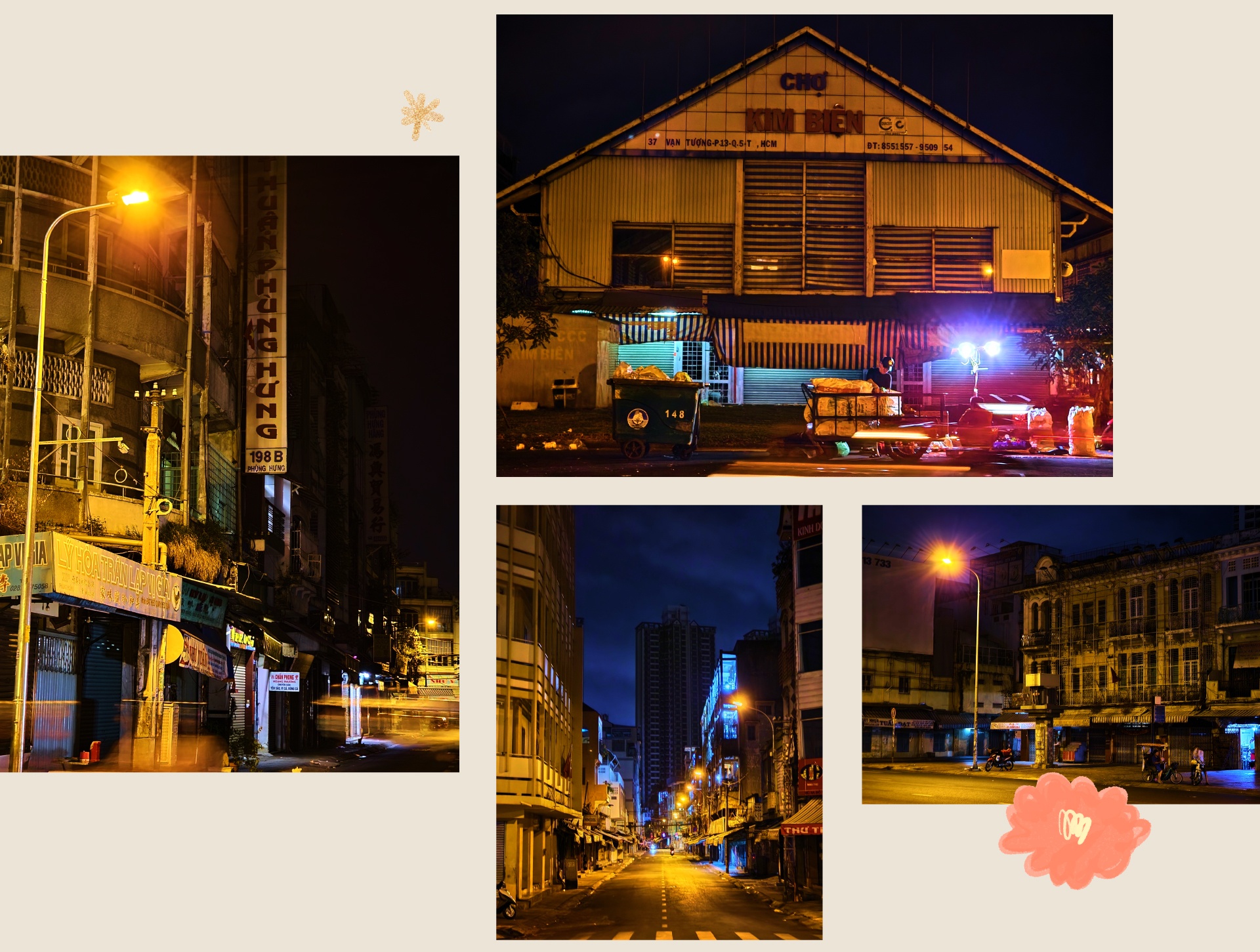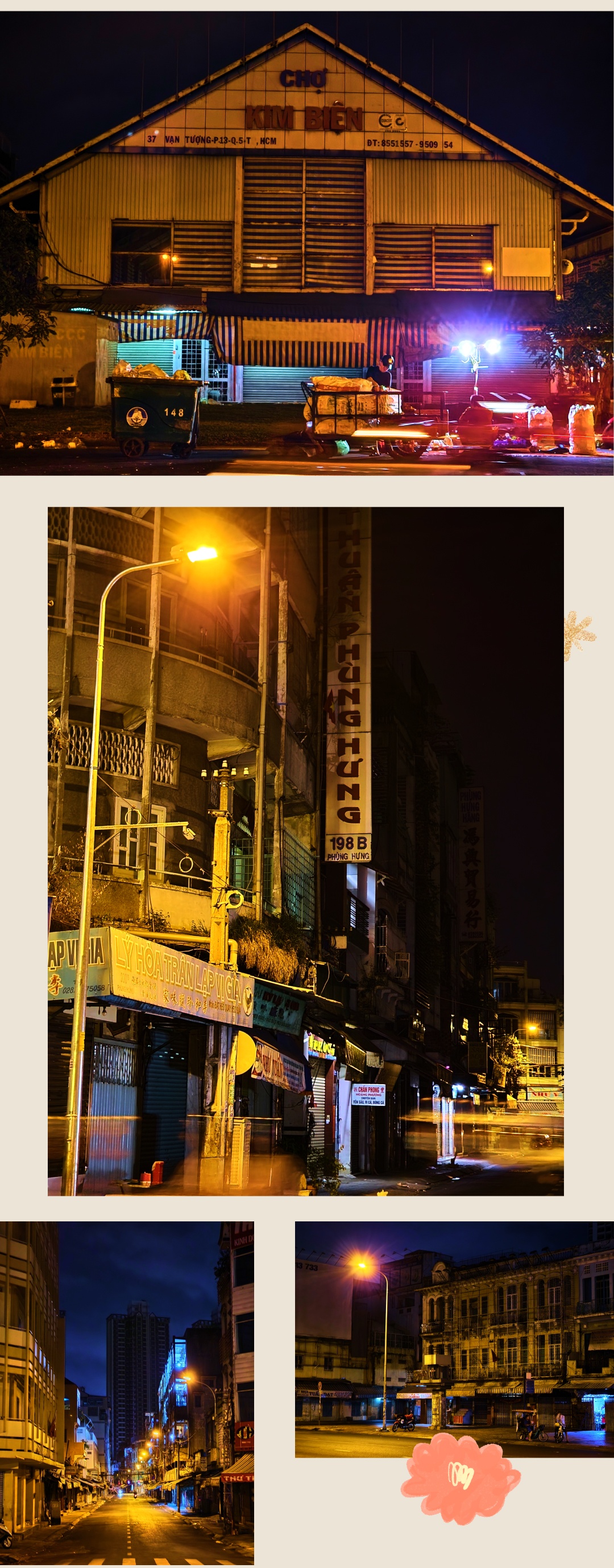 Đường phố khu Chợ Lớn về đêm không náo nhiệt như ban ngày. Trừ một số tuyến đường chính, các con đường nhỏ thưa người hẳn. Loạt dãy nhà ban sớm còn tấp nập hàng hóa, từ các sạp vải đầy màu sắc đến những bao tải đựng dược liệu thơm lừng; đêm về lại mang vẻ đẹp bình dị và yên ắng với góc hiên nhà đóng kín cửa.