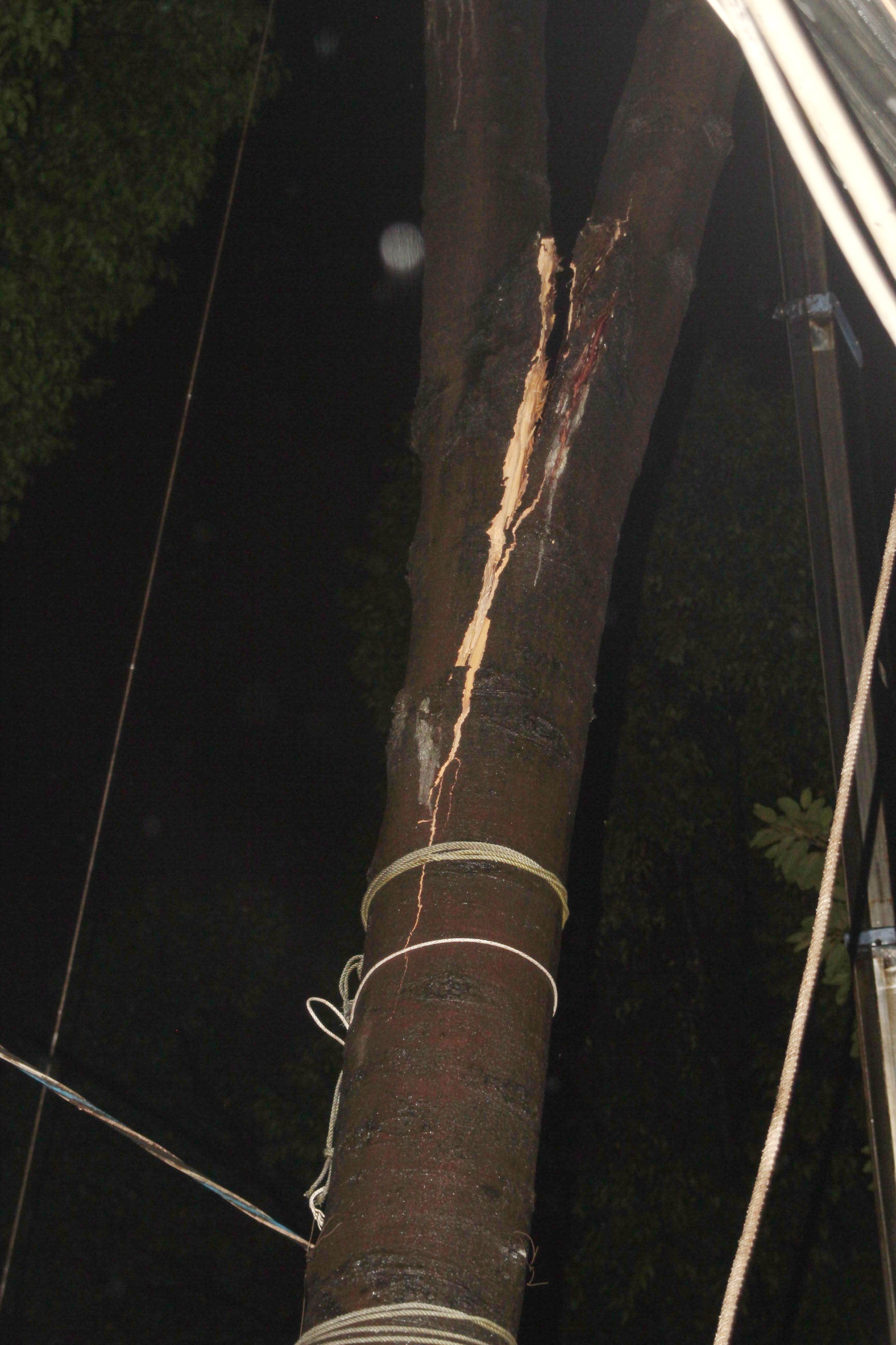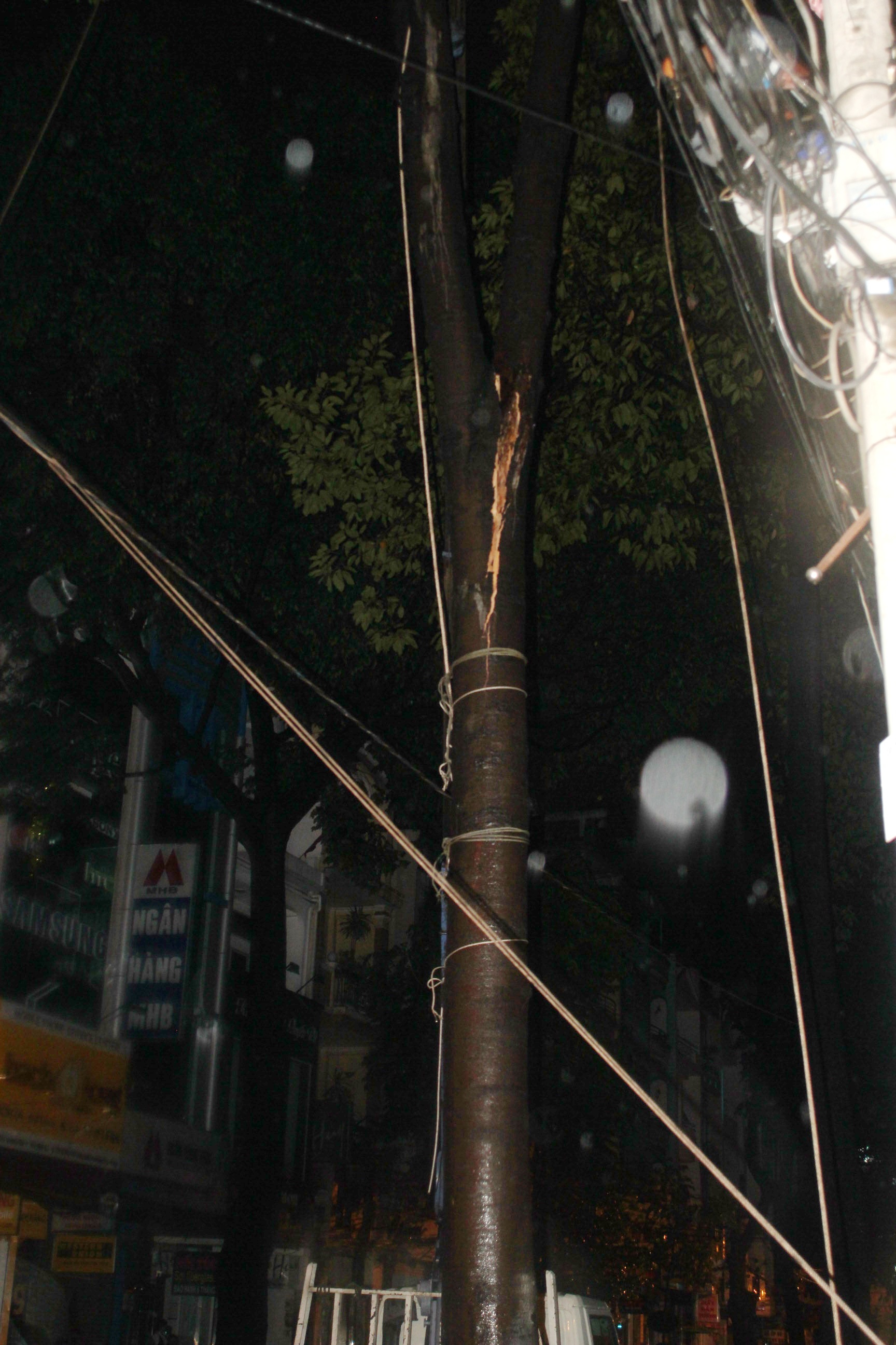 Đường kính của cây khoảng gần 30cm, có 2 nhánh lớn bị tước đôi, khả năng gãy đổ có thể xảy ra bất cứ lúc nào